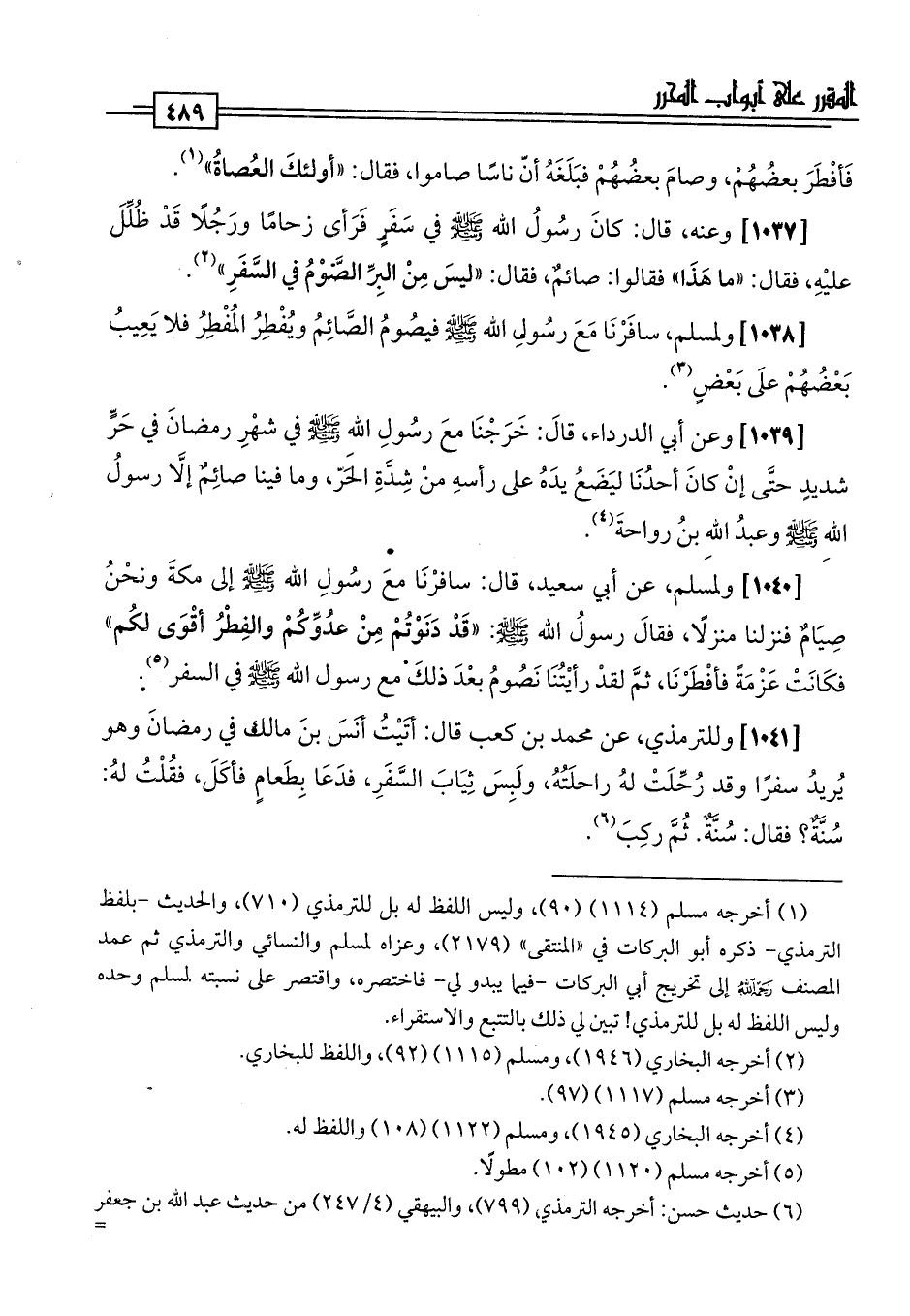 [1038] ولمسلم، سافَرْنَا مع رسُولِ اللَّه -صلى اللَّه عليه وسلم- فيصُومُ الصَّائِمُ ويُفْطِرُ المُفْطِرُ فلا يَعِيبُ بَعْضُهُمْ علَى بَعْضٍ (¬3).