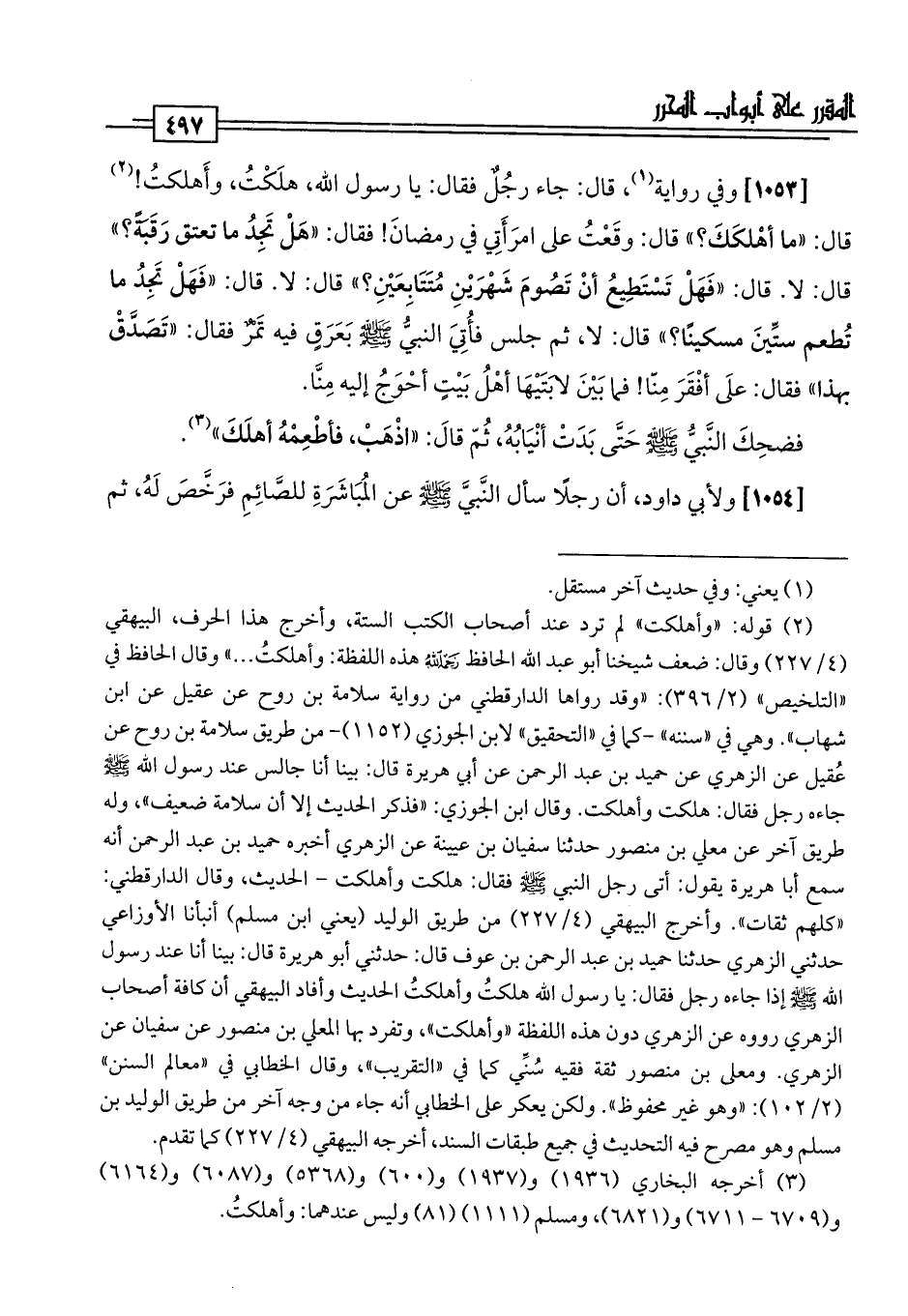 (¬2) قوله: "وأهلكت" لم ترد عند أصحاب الكتب الستة، وأخرج هذا الحرف، البيهقي (4/ 227) وقال: ضعف شيخنا أبو عيد اللَّه الحافظ رحمه اللَّه هذه اللفظة: وأهلكتُ. . . " وقال الحافظ في "التلخيص" (2/ 396): "وقد رواها الدارقطني من رواية سلامة بن روح عن عقيل عن ابن شهاب". وهي في "سننه" -كما في "التحقيق" لابن الجوزي (1152) - من طريق سلامة بن روح عن عُقيل عن الزهري عن حميد بن عبد الرحمن عن أبي هريرة قال: بينا أنا جالس عند رسول اللَّه -صلى اللَّه عليه وسلم- جاءه رجل فقال. هلكت وأهلكت. وقال ابن الجوزي: "فذكر الحديث إلا أن سلامة ضعيف"، وله طريق آخر عن معلي بن منصور حدثنا سفيان بن عيينة عن الزهري أخبره حميد بن عبد الرحمن أنه سمع أبا هريرة يقول: أتى رجل النبي -صلى اللَّه عليه وسلم- فقال: هلكت وأهلكت -الحديث، وقال الدارقطني: "كلهم ثقات". وأخرج البيهقي (4/ 227) من طريق الوليد (يعني ابن مسلم) أنبأنا الأوزاعي حدثني الزهري حدثنا حميد بن عبد الرحمن بن عوف قال: حدثني أبو هريرة قال: بينا أنا عند رسول اللَّه -صلى اللَّه عليه وسلم- إذا جاءه رجل فقال: يا رسول اللَّه هلكتُ وأهلكتُ الحديث وأفاد البيهقي أن كافة أصحاب الزهري رووه عن الزهري دون هذه اللفظة "وأهلك"، وتفرد بها المعلي بن منصور عن سفيان عن الزهري. ومعلى بن منصور ثقة فقيه سُنِّي كما في "التقريب"، وقال الخطابي في "معالم السنن" (2/ 102): "وهو غير محفوظ". ولكن يعكر على الخطابي أنه جاء من وجه آخر من طريق الوليد بن مسلم وهو مصرح فيه التحديث في جميع طبقات السند، أخرجه البيهقي (4/ 227) كما تقدم.