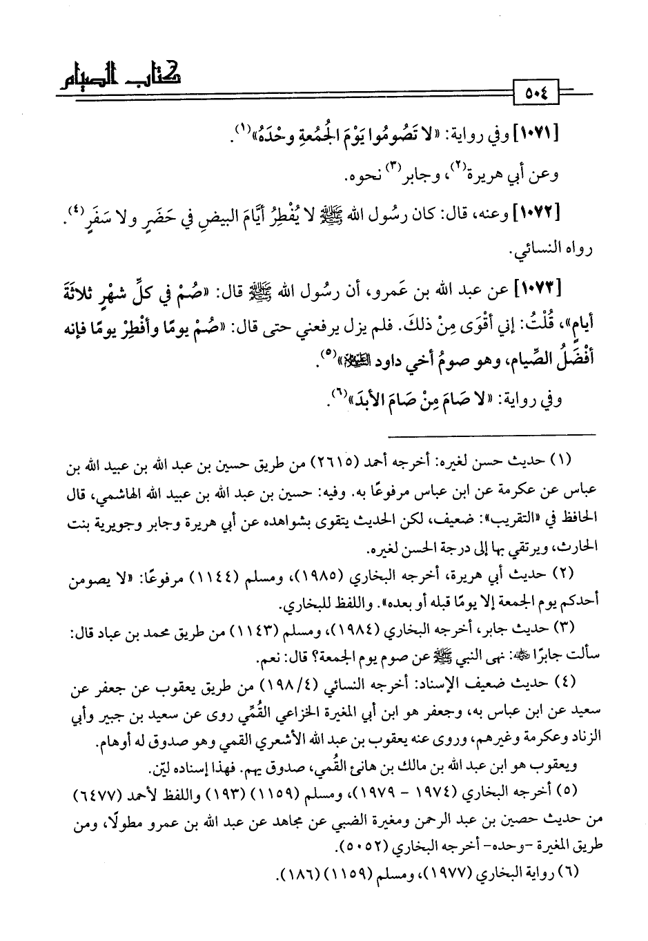 [1073] عن عبد اللَّه بن عَمرو، أن رسُول اللَّه -صلى اللَّه عليه وسلم- قال: "صُمْ في كلِّ شهْرٍ ثلاثَةَ أيامٍ"، قُلْتُ: إني أقْوَى مِنْ ذلكَ. فلم يزل يرفعني حتى قال: "صُمْ يومًا وأفْطِرْ يومًا فإنه أفْضَلُ الصِّيام، وهو صومُ أخي داود عليه السلام" (¬5).