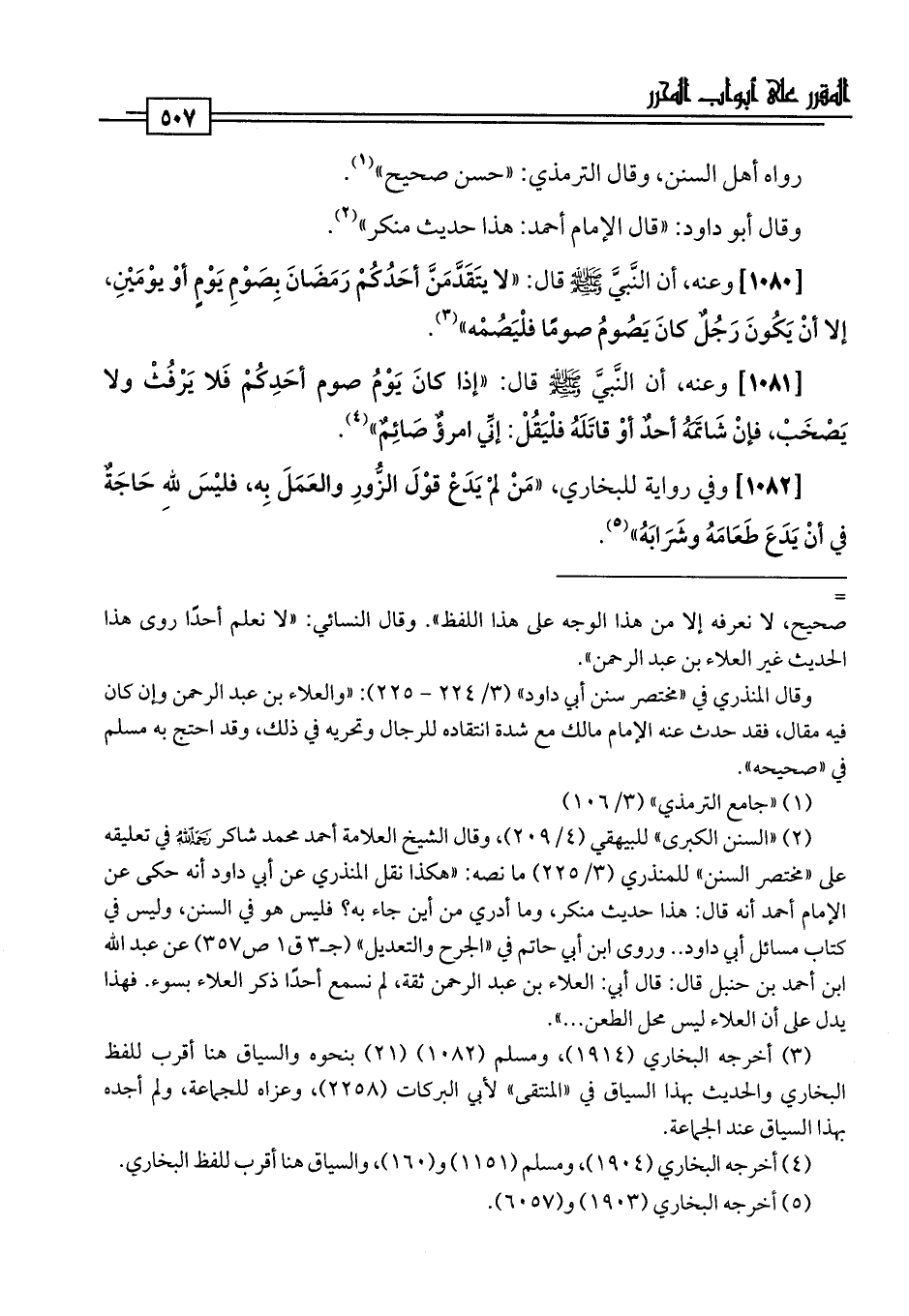[1080] وعنه، أن النَّبيّ -صلى اللَّه عليه وسلم- قال: "لا يتَقَدَّمَنَّ أحَدُكُمْ رَمَضَانَ بِصَوْمِ يَوْمٍ أَوْ يوْمَيْنِ، إلا أنْ يَكُونَ رَجُلٌ كَانَ يَصُومُ صومًا فلْيَصمْه" (¬3).
