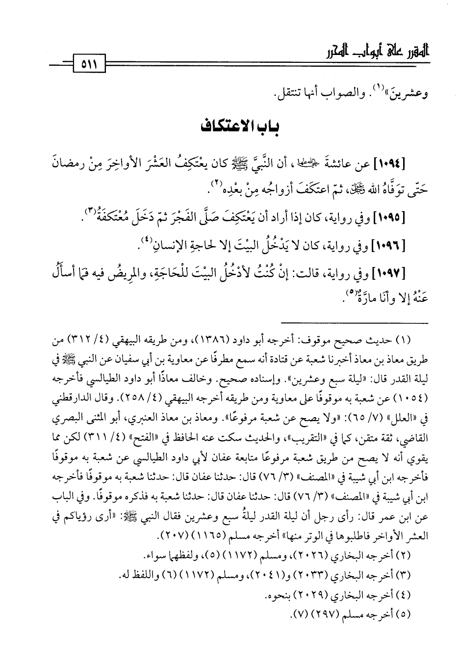 [1094] عن عائشةَ -رضي اللَّه عنها-، أن النَّبيَّ -صلى اللَّه عليه وسلم- كان يعْتَكِفُ العَشْرَ الأواخِرَ مِنْ رمضانَ حَتّى توَفَّاهُ اللَّه عَزَّ وَجَلَّ، ثمّ اعتَكَفَ أزواجُه مِنْ بعْدِه (¬2).