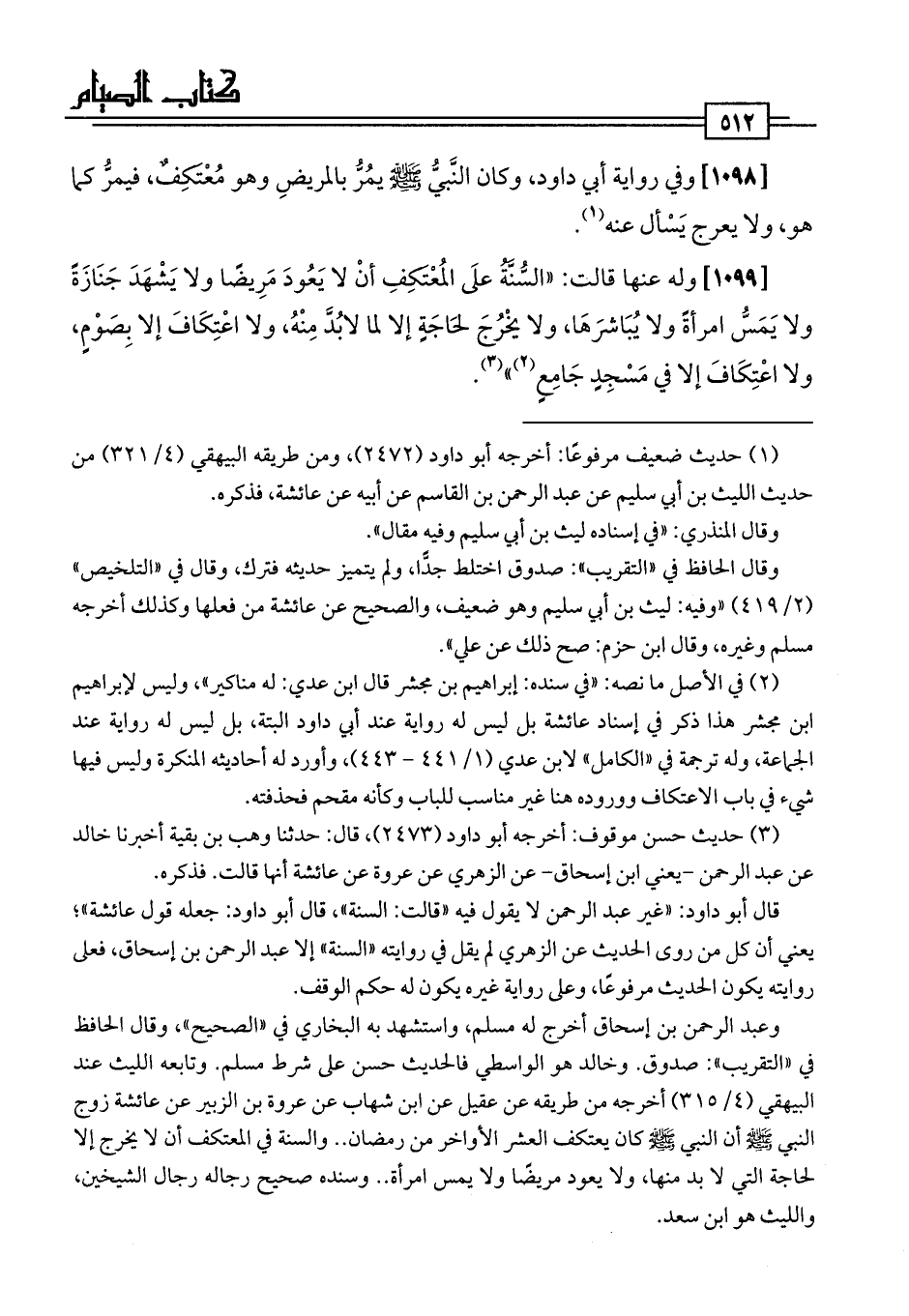 [1098] وفي رواية أبي داود، وكان النَّبيُّ -صلى اللَّه عليه وسلم- يمُرُّ بالمريضِ وهو مُعْتكِفٌ، فيمرُّ كما هو، ولا يعرج يَسْأل عنه (¬1).