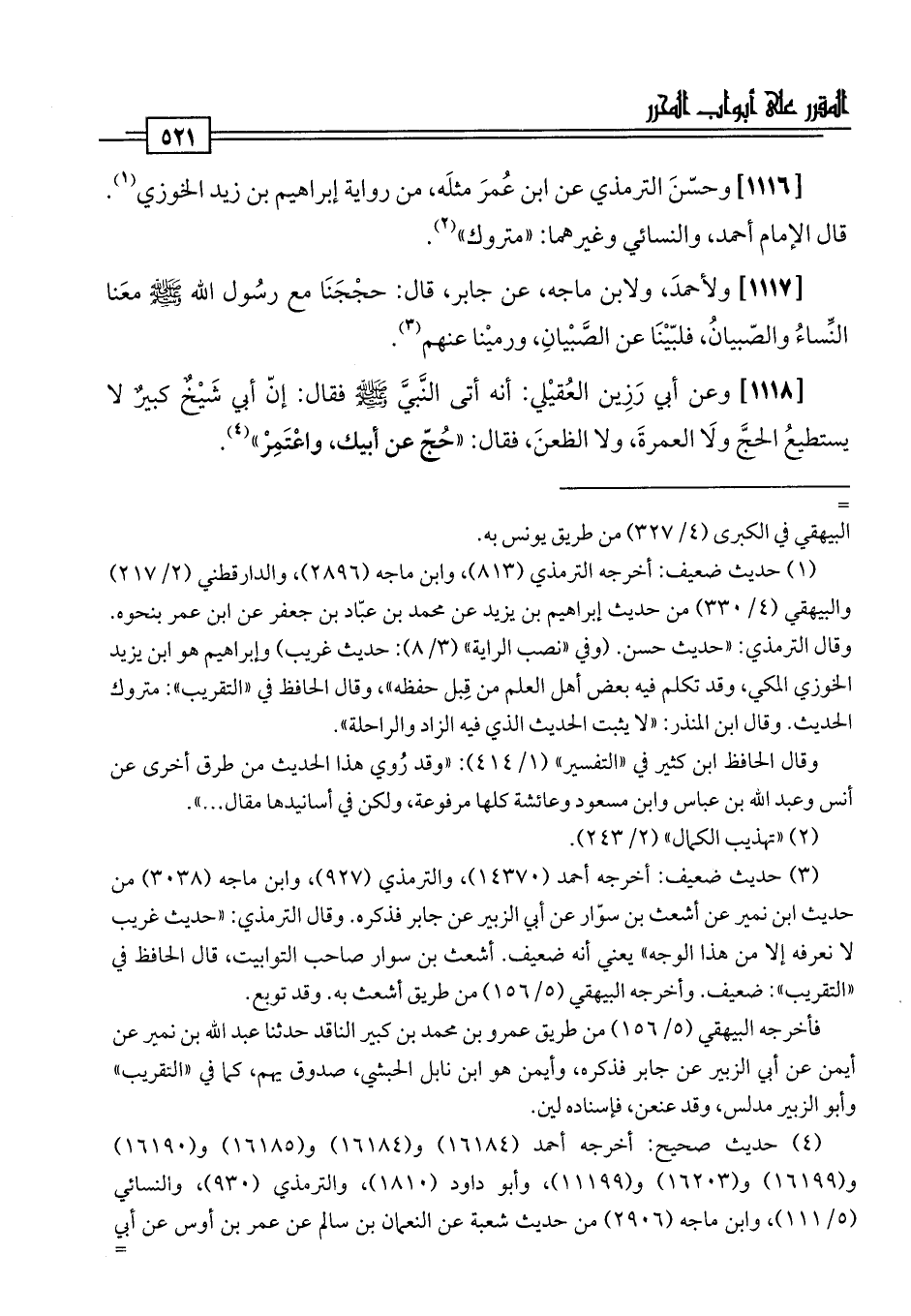 [1118] وعن أبي رَزِين العُقيْلي: أنه أتى النَّبىَّ -صلى اللَّه عليه وسلم- فقال: إنّ أبي شَيْخٌ كبيرٌ لا يستطيعُ الحجَّ ولَا العمرةَ، ولا الظعنَ، فقال: "حُجّ عن أبيك، واعْتَمِرْ" (¬4).