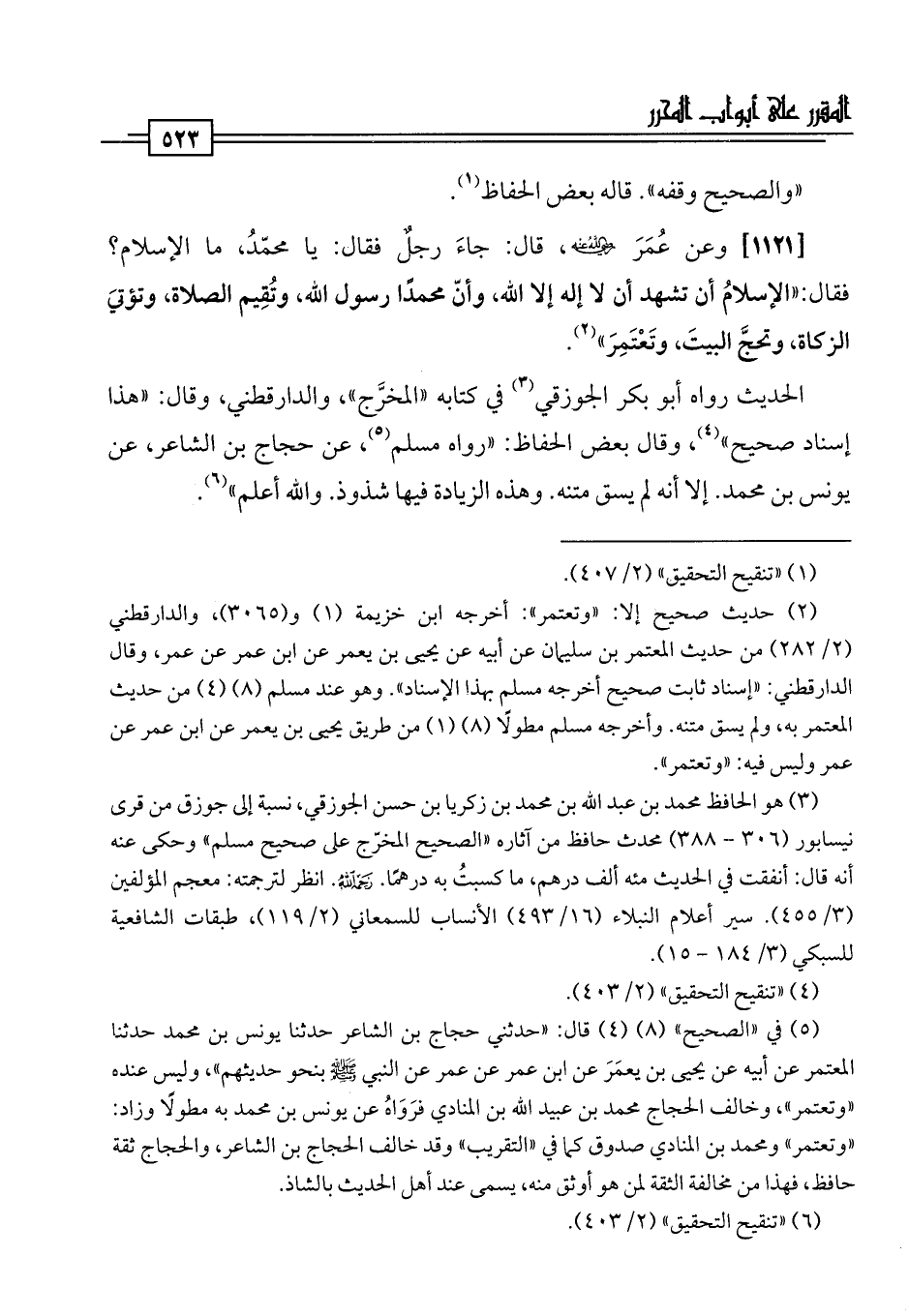 [1121] وعن عُمَرَ -رضي اللَّه عنه-، قال: جاءَ رجلٌ فقال: يا محمّدُ، ما الإسلام؟ فقال: "الإسلامُ أن تشهد أن لا إله إلا اللَّه، وأنّ محمدًا رسول اللَّه، وتُقِيم الصلاة، وتؤتيَ الزكاة، وتحجَّ البيتَ، وتَعْتَمِرَ" (¬2).
