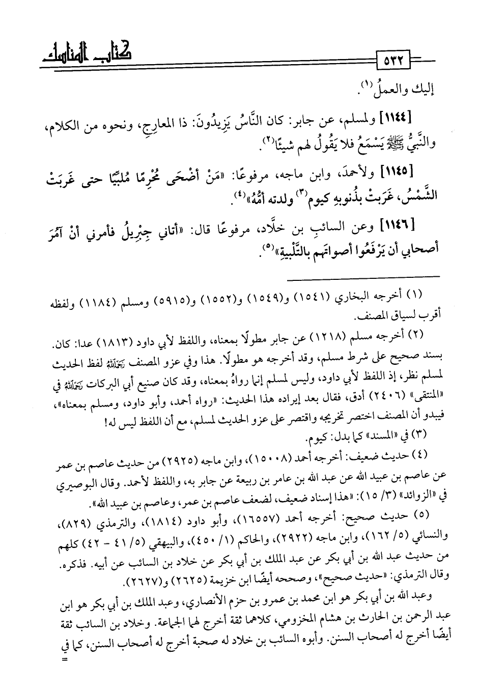[1146] وعن السائبِ بن خلَّاد، مرفوعًا قال: "أتاني جِبْرِيلُ فأمرني أنْ آمُرَ أصحابي أن يَرْفَعُوا أصواتَهم بالتَّلْبيةِ" (¬5).