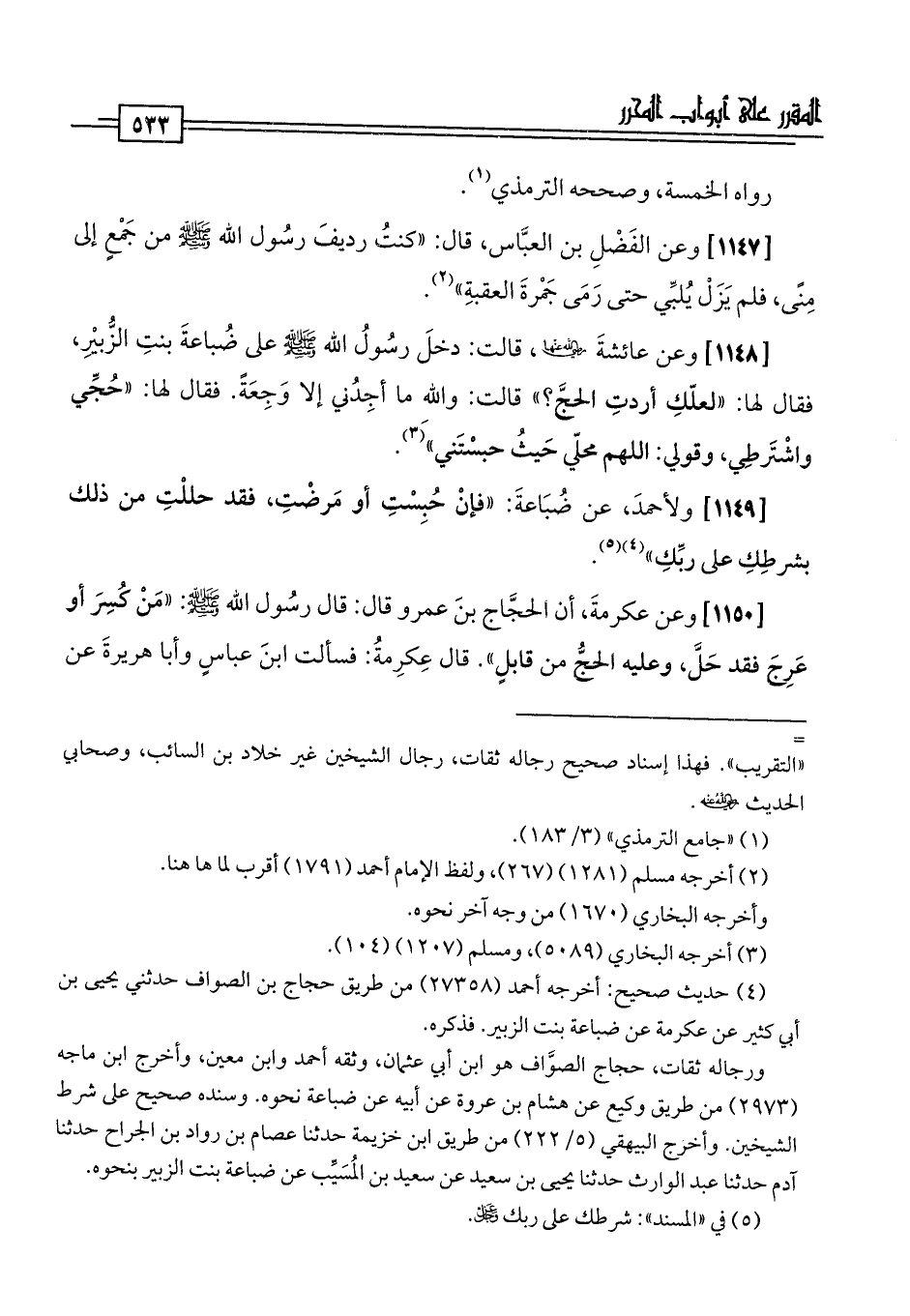 [1149] ولأحمدَ، عن ضُبَاعةَ: "فإنْ حُبِسْتِ أو مَرضْتِ، فقد حللْتِ من ذلك بشرطِكِ على ربِّكِ" (¬4) (¬5).