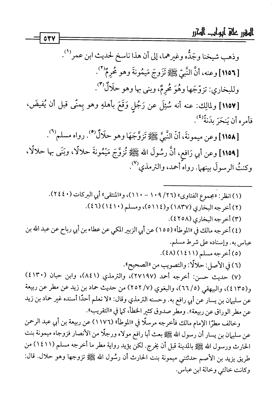 [1158] وعن ميمونةَ، أنّ النَّبيّ -صلى اللَّه عليه وسلم- تَزوَّجَهَا وهو حلَالٌ (¬5). رواه مسلم (¬6).