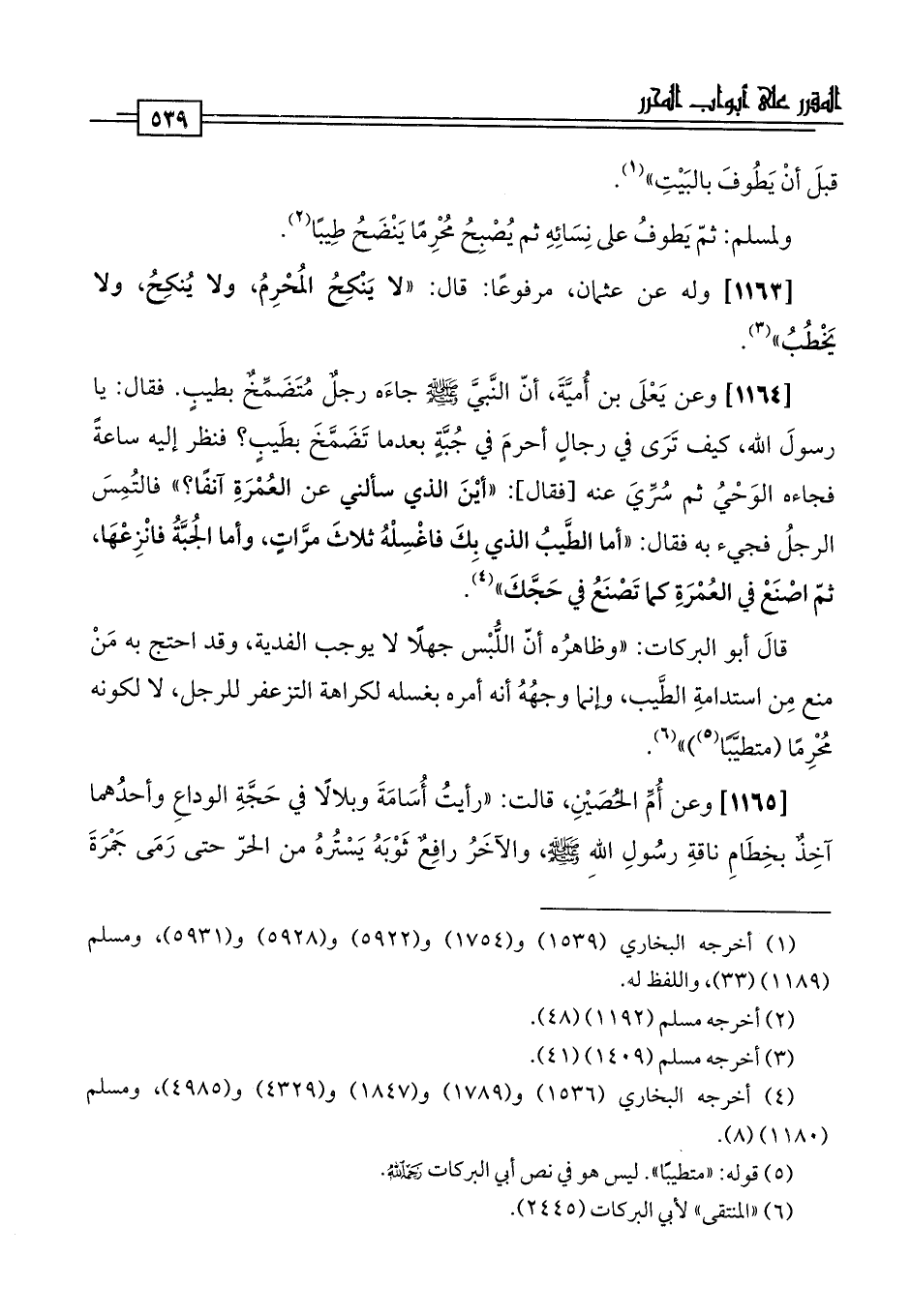 [1164] وعن يَعْلَى بن أُميَّةَ، أنّ النَّبيَّ -صلى اللَّه عليه وسلم- جاءَه رجلٌ مُتَضَمِّحٌ بطيبٍ. فقال: يا رسولَ اللَّه، كيف تَرَى في رجالٍ أحرمَ في جُبَّةٍ بعدما تَضَمَّخَ بطَيبٍ؟ فنظر إليه ساعةً فجاءه الوَحْيُ ثم سُرِّيَ عنه [فقال]: "أيْنَ الذي سألني عن العُمْرَةِ آنفًا؟ " فالتُمِسَ الرجلُ فجيء به فقال: "أما الطَّيبُ الذي بِكَ فاغْسِلْهُ ثلاثَ مرَّاتٍ، وأما الجُبَّةُ فانْزِعْهَا، ثمّ اصْنَعْ في العُمْرَةِ كما تَصْنَعُ في حَجَّكَ" (¬4).