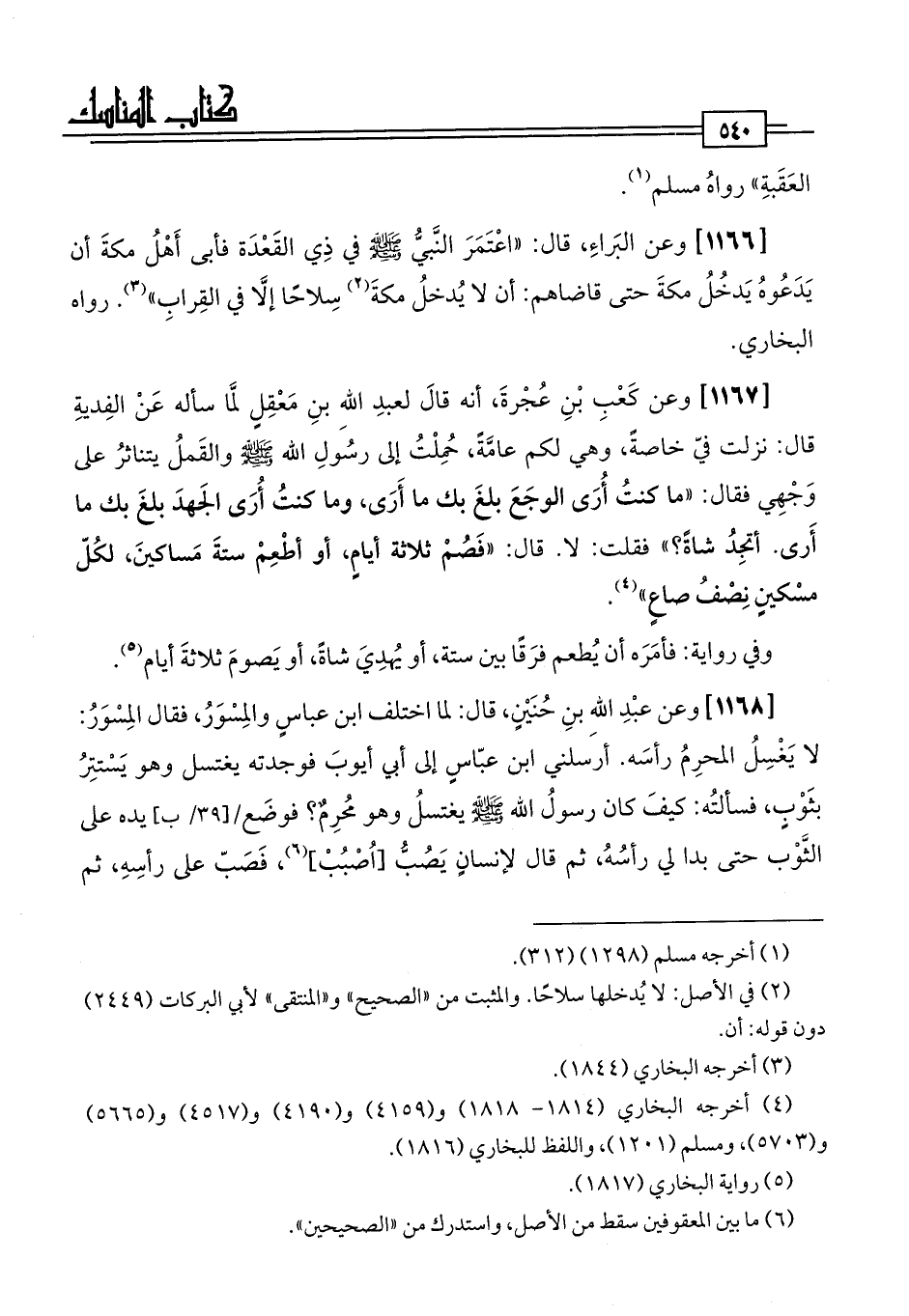 [1167] وعن كَعْبِ بْنِ عُجْرةَ، أنه قَالَ لعبدِ اللَّهِ بنِ مَعْقِلٍ لمَّا سأله عَنْ الفِديةِ قال: نزلت فيّ خاصةً، وهي لكم عامَّةً، حُمِلْتُ إلى رسُولِ اللَّه -صلى اللَّه عليه وسلم- والقَملُ يتناثرُ على وَجْهِي فقال: "ما كنتُ أُرَى الوجَعَ بلغَ بك ما أَرَى، وما كنتُ أُرَى الجَهدَ بلغَ بك ما أَرى. أتجِدُ شاةً؟ " فقلت: لا. قال: "فَصُمْ ثلاثة أيامٍ، أو أطْعِمْ ستةَ مَساكينَ، لكُلّ مسْكينٍ نِصْفُ صاعٍ" (¬4).
