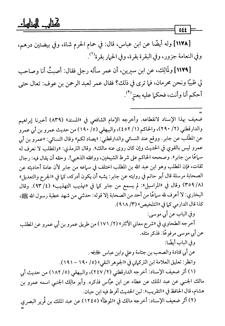 [1179] ولمَالِك، عن ابن سيرين، أن عمر سأله رجل فقال: أصبتُ أنا وصاحب لي ظبيًا ونحن محرمان، فما ترى في ذلك؟ فقال عمر لعبد الرحمن بن عوف: تعال حتى أحكم أنا وأنت، فحكما عليه بعنزٍ (¬2).