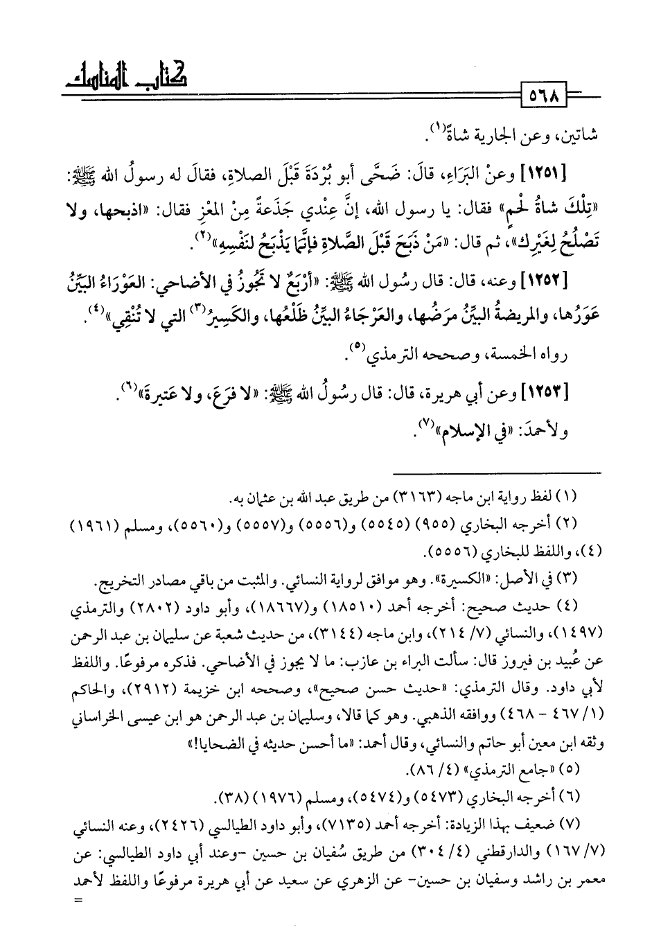 (¬4) حديث صحيح: أخرجه أحمد (18510) و (18667)، وأبو داود (2802) والترمذي (1497)، والنسائي (7/ 214)، وابن ماجه (3144)، من حديث شعبة عن سليمان بن عبد الرحمن عن عُبيد بن فيروز قال: سألت البراء بن عازب: ما لا يجوز في الأضاحي. فذكره مرفوعًا. واللفظ لأبي داود. وقال الترمذي: "حديث حسن صحيح"، وصححه ابن خزيمة (2912)، والحاكم (1/ 467 - 468) ووافقه الذهبي. وهو كما قالا، وسليمان بن عبد الرحمن هو ابن عيسى الخراساني وثقه ابن معين أبو حاتم والنسائي، وقال أحمد: "ما أحسن حديثه في الضحايا! "