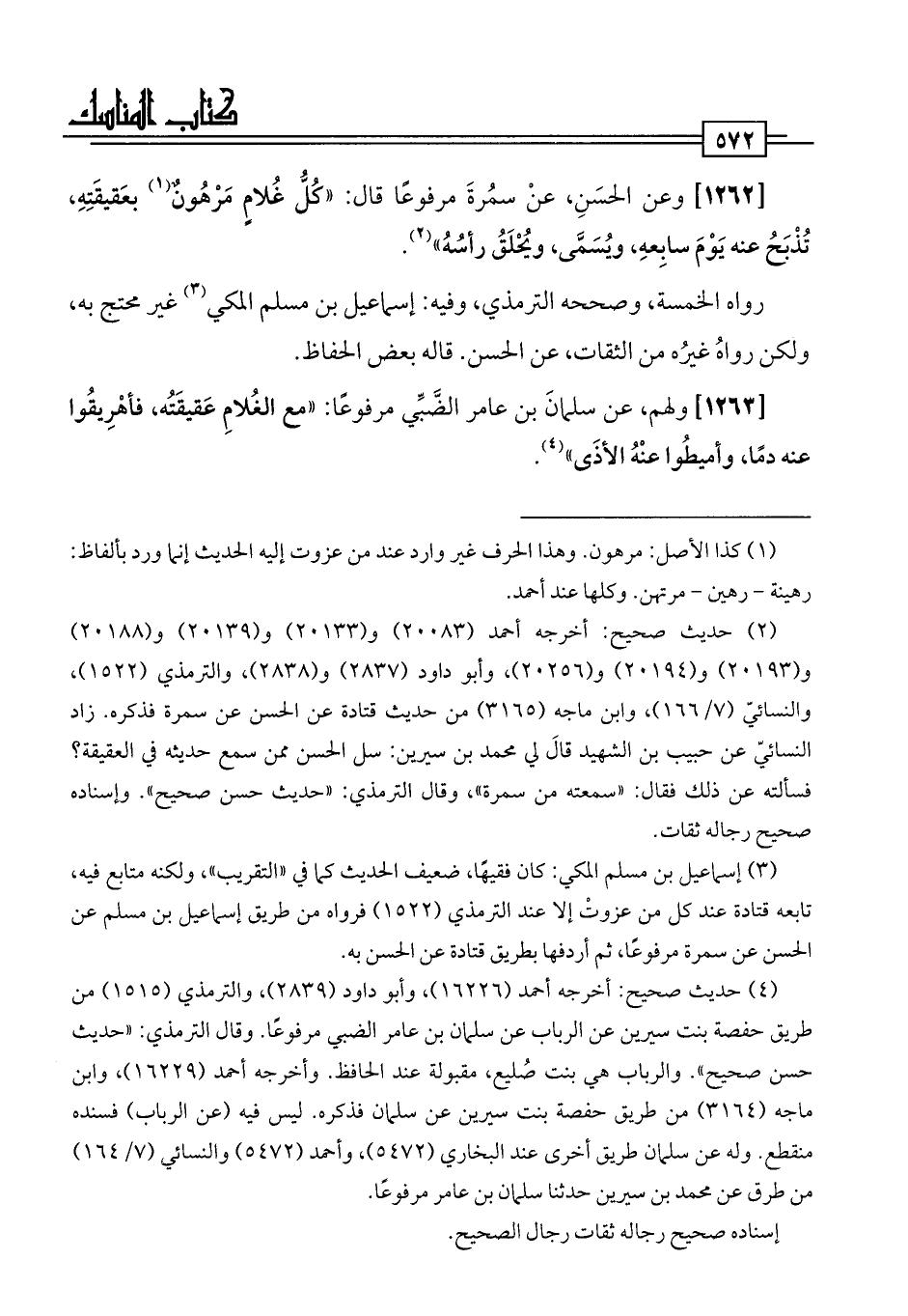 [1262] وعن الحسَنِ، عنْ سمُرةَ مرفوعًا قال: "كُلُّ غُلامٍ مَرْهُونٌ (¬1) بعَقيقَتِهِ، تُذْبَحُ عنه يَوْمَ سابِعهِ، ويُسَمَّى، ويُحْلَقُ رأسُهُ" (¬2).
