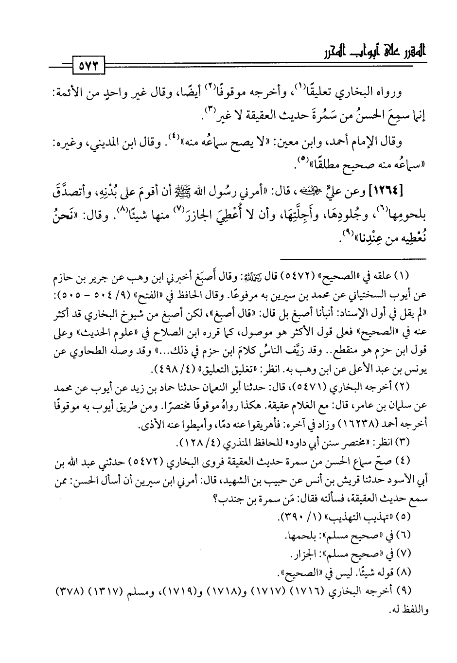 ورواه البخاري تعليقًا (¬1)، وأخرجه موقوفًا (¬2) أيضًا، وقال غير واحدٍ من الأئمة: إنما سمِعَ الحسنُ من سَمُرةَ حديث العقيقة لا غير (¬3).