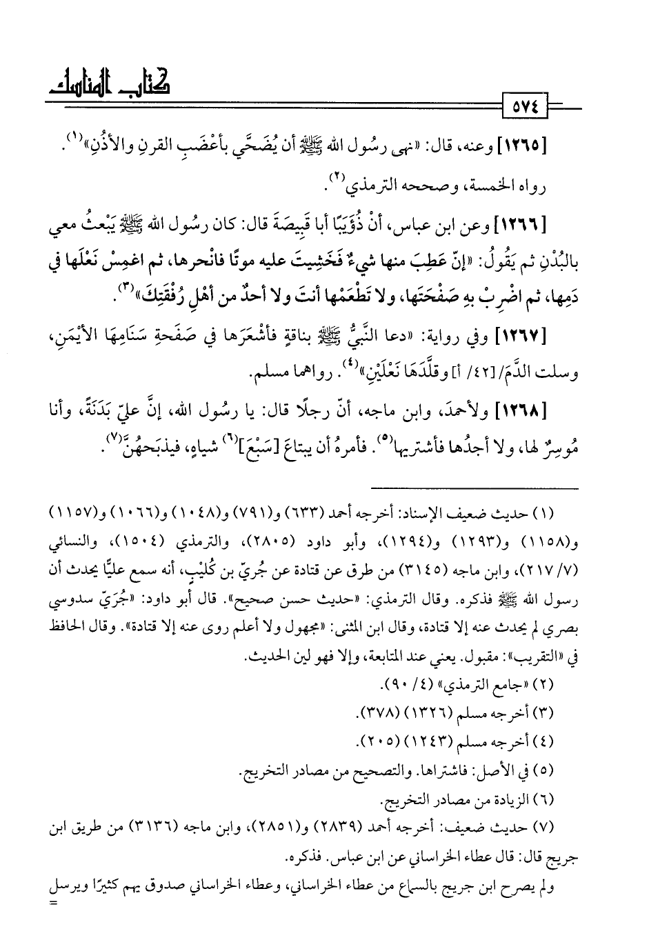 [1265] وعنه، قال: "نهى رسُول اللَّه -صلى اللَّه عليه وسلم- أن يُضَحَّي بأعْضَبِ القرنِ والأذُنِ" (¬1). رواه الخمسة، وصححه الترمذي (¬2).