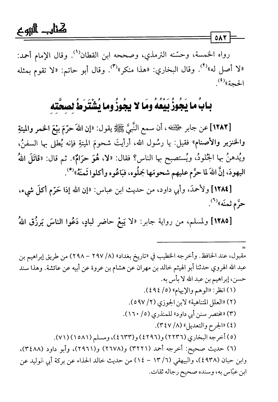 [1283] عن جابر -رضي اللَّه عنه-، أن سمع النَّبيَّ -صلى اللَّه عليه وسلم- يقول: "إن اللَّهَ حرّمَ بيْعَ الخمر والميتةِ والخنزير والأصنام" فقيل: يا رسُول اللَّه، أرأيتَ شحومَ الميتةِ فإنه يُطلى بها السفنُ، ويُدهنُ بها الجُلودُ، ويُستصبح بها الناس؟ فقال: "لا، هُوَ حرَامٌ". ثم قال: "قاتَلَ اللَّهُ اليهودَ، إنَّ اللَّهَ لما حرَّم عليهم شحومَها جَملُوه، فبَاعُوه وأكلوا ثَمنَهُ" (¬5).