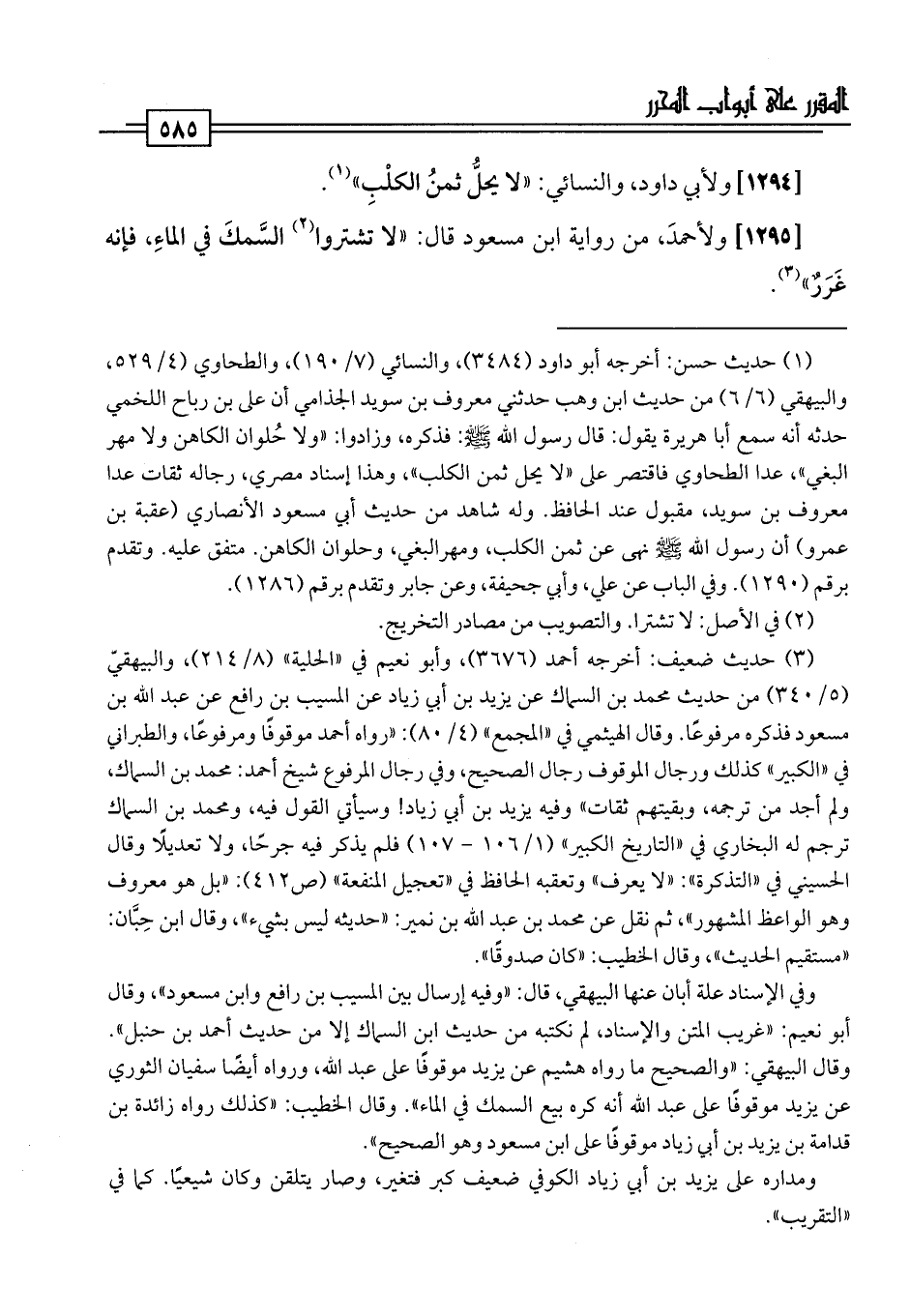 [1295] ولأحمدَ، من رواية ابن مسعود قال: "لا تشتروا (¬2) السَّمكَ في الماءِ، فإنه غَرَرٌ" (¬3).