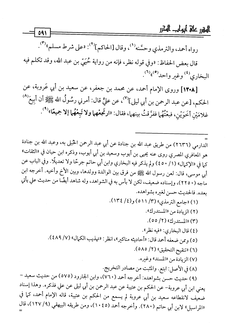 [1308] وروى الإمام أحمد، عن محمد بن جعفر، عن سعيد بن أبي عَروبة، عن الحكم، [عن عبد الرحمن بن أبي ليلى] (¬7)، عن عليٍّ قال: أمرني رسُولُ اللَّه -صلى اللَّه عليه وسلم- أن أبِيعَ (¬8) غلامَيْنِ أخَوَيْنِ، فبعْتُهُما ففرَّقتُ بينهما، فقال: "ارتَجعْهما ولا تَبِعْهُما إلَّا جميعًا" (¬9).