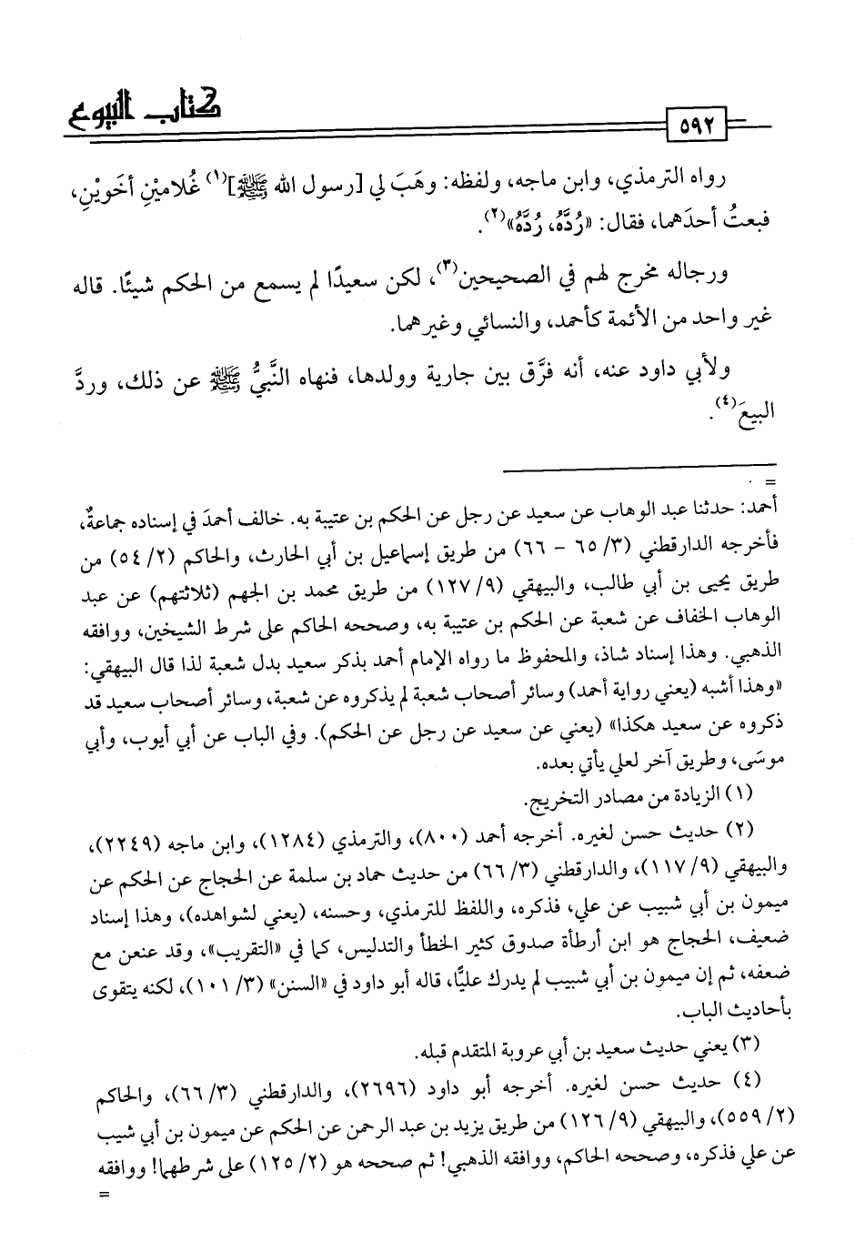 رواه الترمذي، وابن ماجه، ولفظه: وهَبَ لي [رسول اللَّه -صلى اللَّه عليه وسلم-] (¬1) غُلاميْنِ أخَويْن، فبعتُ أحدَهما، فقال: "رُدَّهُ، رُدَّهُ" (¬2).