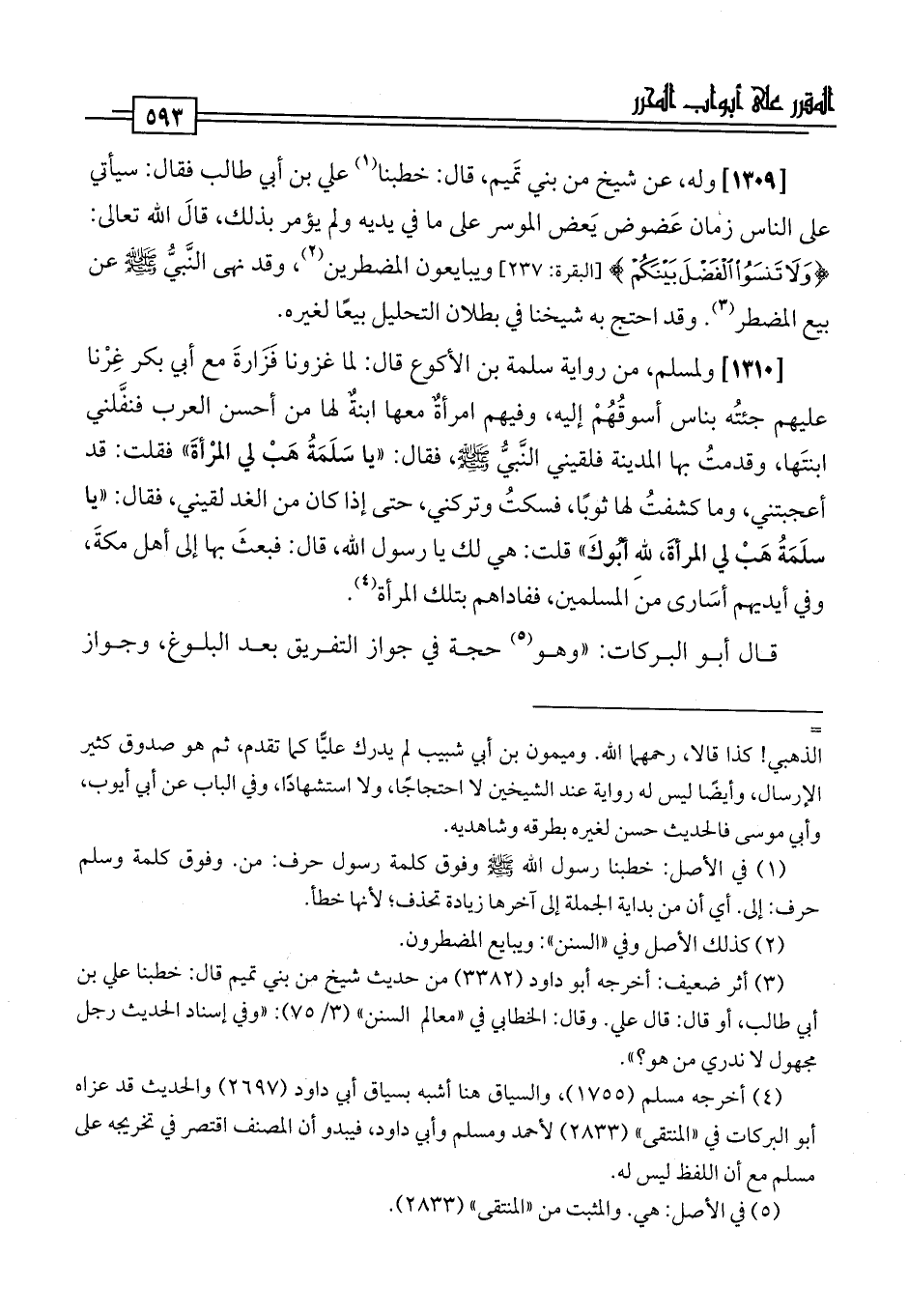 [1309] وله، عن شيخ من بني تَميم، قال: خطبنا (¬1) علي بن أبي طالب فقال: سيأتي على الناس زمان عَضوض يَعض الموسر على ما في يديه ولم يؤمر بذلك، قَالَ اللَّه تعالى: {وَلَا تَنْسَوُا الْفَضْلَ بَيْنَكُمْ} [البقرة: 237] ويبايعون المضطرين (¬2)، وقد نهى النَّبيُّ -صلى اللَّه عليه وسلم- عن بيع المضطر (¬3). وقد احتج به شيخنا في بطلان التحليل بيعًا لغيره.