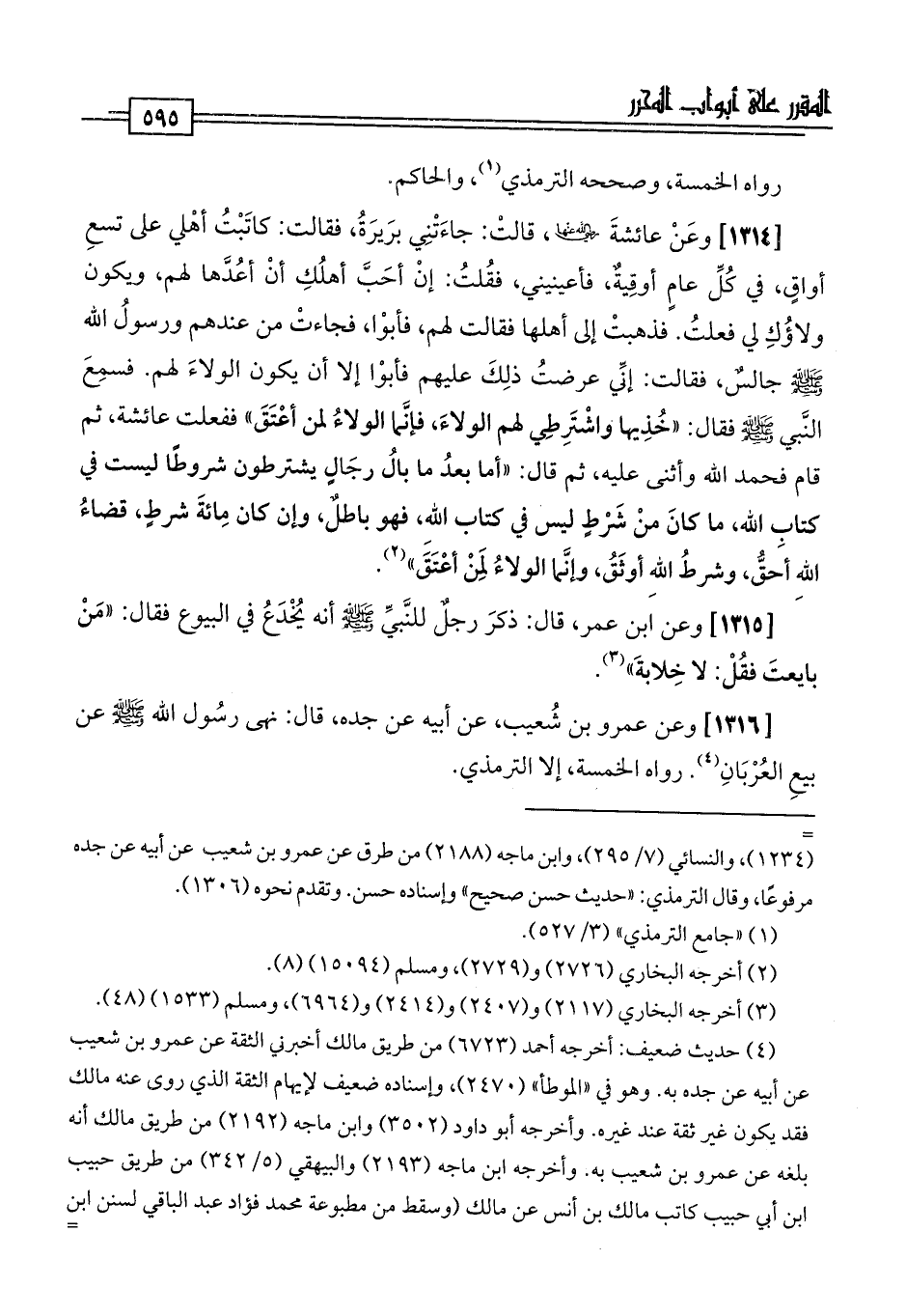 [1316] وعن عمرو بن شُعيب، عن أبيه عن جده، قال: نهى رسُول اللَّه -صلى اللَّه عليه وسلم- عن بيعِ العُرْبَانِ (¬4). رواه الخمسة، إلَّا الترمذي.
