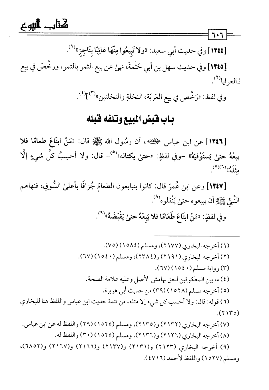 [1346] عن ابن عباس -رضي اللَّه عنهما-، أن رسُول اللَّه -صلى اللَّه عليه وسلم- قال: "مَنْ ابتَاعَ طعامًا فلا يبعْهُ حتى يَستَوْفيَهُ" -وفي لفظٍ: "حتى يكتاله" (¬5) - قال: ولا أحسِبُ كلَّ شيءٍ إلَّا مِثْلَهُ" (¬6) (¬7).