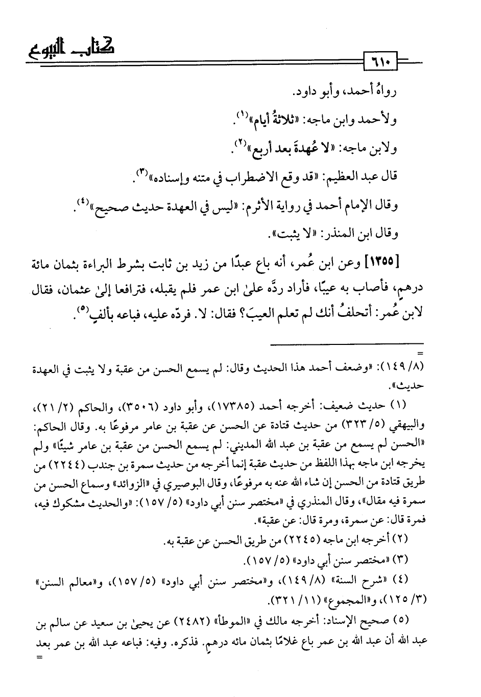 [1355] وعن ابن عُمر، أنه باع عبدًا من زيد بن ثابت بشرط البراءة بثمان مائة درهمٍ، فأصاب به عيبًا، فأراد ردَّه على ابن عمر فلم يقبله، فترافعا إلى عثمان، فقال لابن عُمر: أتحلفُ أنك لم تعلم العيبَ؟ فقال: لا. فردّه عليه، فباعه بألفٍ (¬5).