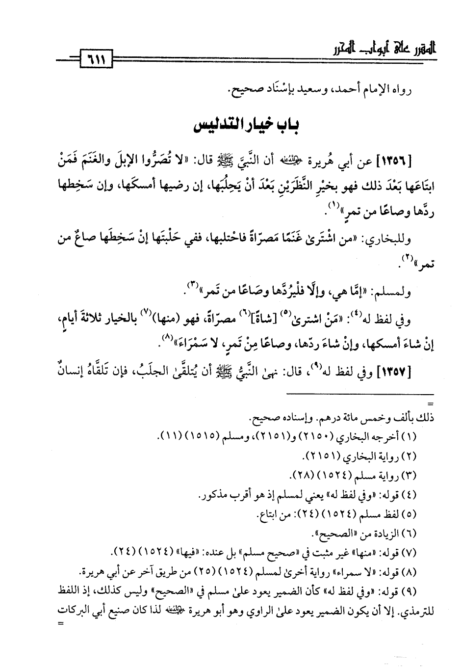 [1356] عن أبي هُريرة -رضي اللَّه عنه- أن النَّبيَّ -صلى اللَّه عليه وسلم- قال: "لا تُصَرُّوا الإبلَ والغَنَمَ فَمَنْ ابتَاعَها بَعْدَ ذلك فهو بخيْرِ النَّظَرَيْنِ بَعْدَ أنْ يَحِلُبَها، إن رضيها أمسكَها، وإن سَخِطها ردَّها وصاعًا من تمرٍ" (¬1).