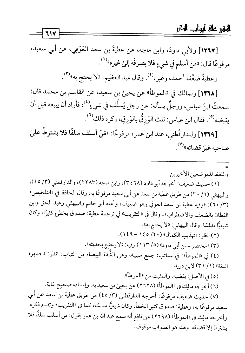 [1367] ولأبي داودَ، وابن ماجه، عن عطيةَ بن سعد العَوْفِي، عن أبي سعيد، مرفوعًا قال: "من أسلم في شيء فلا يصرفْه إلى غيره" (¬1).