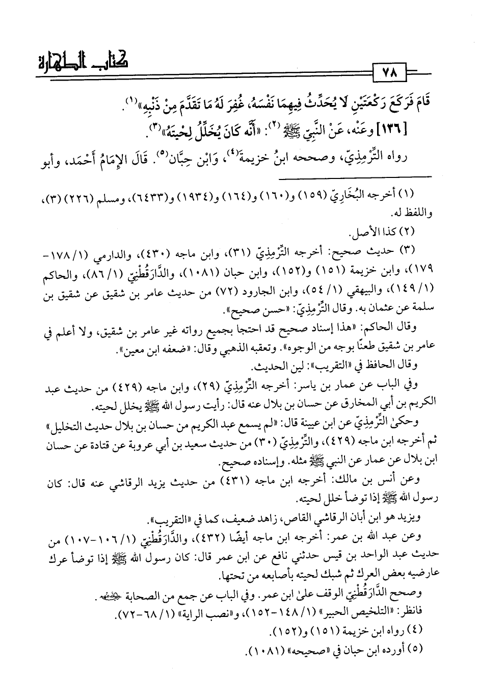 [136] وعَنْه، عَنْ النَّبِيّ -صلى اللَّه عليه وسلم- (¬2): "أَنَّه كَانَ يُخَلِّلُ لِحْيتَهُ" (¬3).