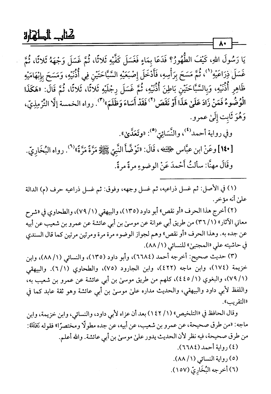 [140] وعَنْ ابن عبَّاس -رضي اللَّه عنهما-، قَالَ: "تَوْضَّأَ النَّبِيّ -صلى اللَّه عليه وسلم- مَرَّةً مَرَّةً" (¬6). رواه البُخَارِيّ.