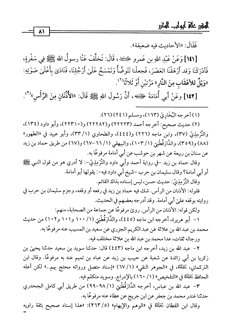 [142] وعَنْ أَبي أُمَامَةَ -رضي اللَّه عنه-، أَنَّ رَسُولَ اللَّهِ -صلى اللَّه عليه وسلم- قَالَ: "الأُذُنَانِ مِنَ الرَّأْسِ" (¬2).