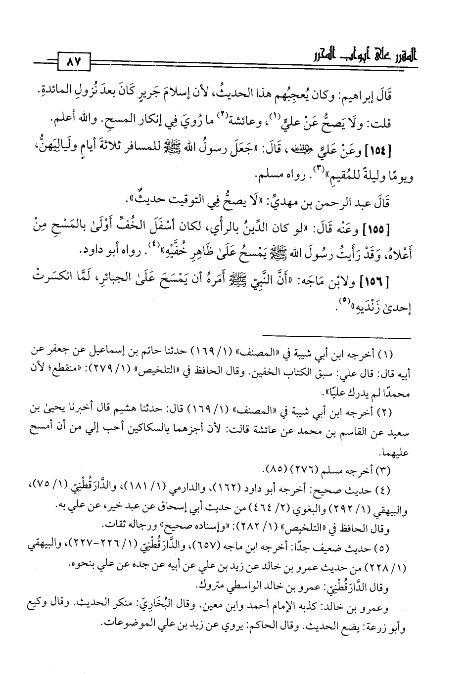 [154] وعَنْ عَليٍّ -رضي اللَّه عنه-، قَالَ: "جَعَلَ رسولُ اللَّه -صلى اللَّه عليه وسلم- للمسافر ثلاثةَ أيامٍ ولَيالِيَهنُّ، ويومًا وليلةً للمُقيمِ" (¬3). رواه مسلم.