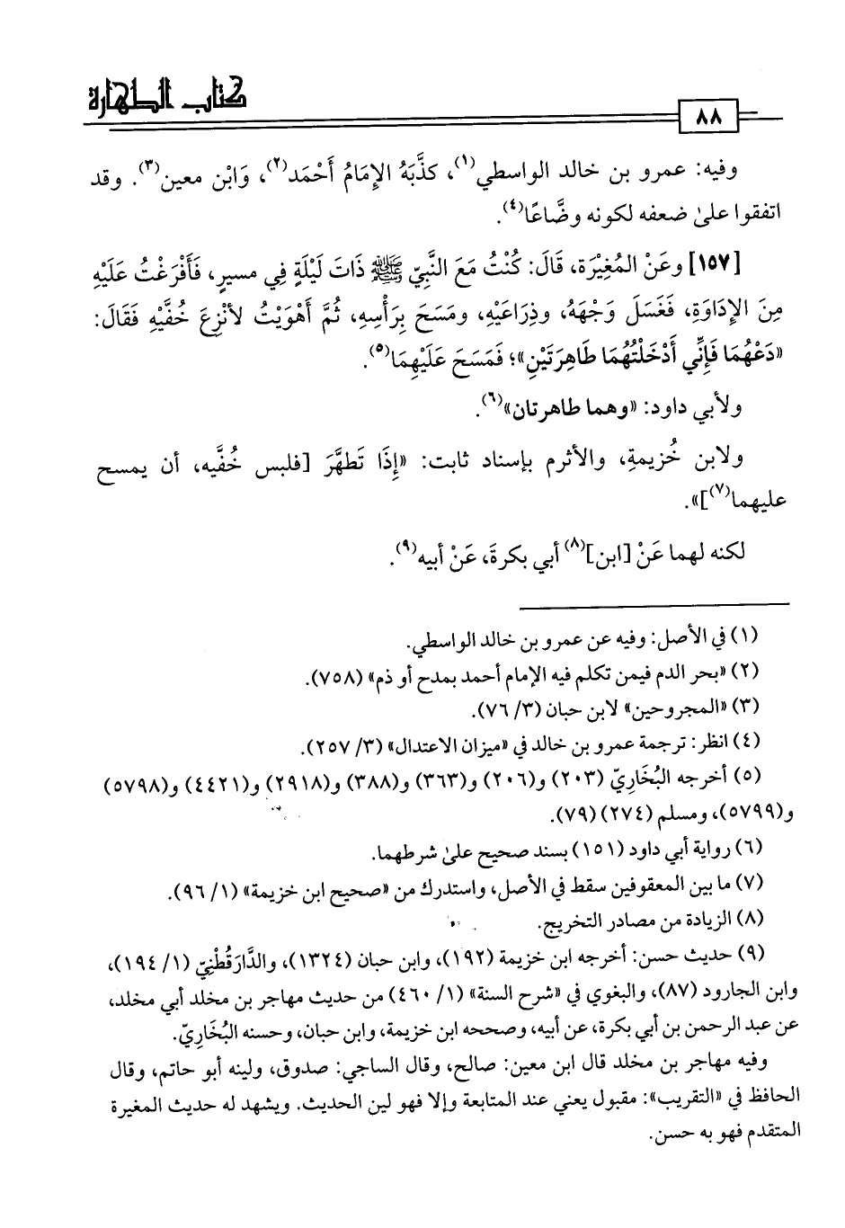 [157] وعَنْ المُغِيْرَة، قَالَ: كُنْتُ مَعَ النَّبِيّ -صلى اللَّه عليه وسلم- ذَاتَ لَيْلَةِ فِي مسيرٍ، فَأَفْرَغْتُ عَلَيْهِ مِنَ الإِدَاوَةِ، فَغَسَلَ وَجْهَهُ، وذِرَاعَيْهِ، ومَسَحَ بِرَأْسِهِ، ثُمَّ أَهْوَيْتُ لأنْزِعَ خُفَّيْهِ فَقَالَ: "دَعْهُمَا فَإِنِّي أَدْخَلْتُهُمَا طَاهِرَتَيْنِ"، فَمَسَحَ عَلَيْهِمَا (¬5).