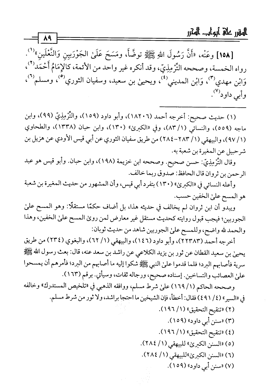 [158] وعَنْه، "أَنَّ رَسُولَ اللَّهِ -صلى اللَّه عليه وسلم- توضَّأَ، ومَسَحَ عَلَى الجَوْرَبيِنِ وَالنَّعْلَينِ" (¬1).