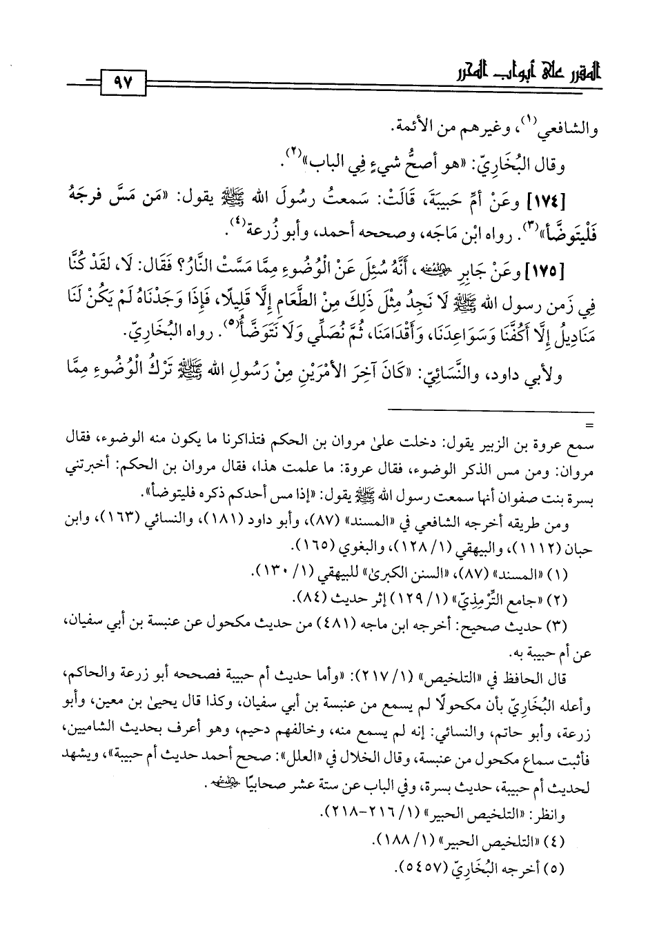 قال الحافظ في "التلخيص" (1/ 217): "وأما حديث أم حبيبة فصححه أبو زرعة والحاكم، وأعله البُخَارِيّ بأن مكحولًا لم يسمع من عنبسة بن أبي سفيان، وكذا قال يحيى بن معين، وأبو زرعة، وأبو حاتم، والنسائي: إنه لم يسمع منه، وخالفهم دحيم، وهو أعرف بحديث الشاميين، فأثبت سماع مكحول من عنبسة، وقال الخلال في "العلل": صحح أحمد حديث أم حبيبة"، ويشهد لحديث أم حبيبة، حديث بسرة، وفي الباب عن ستة عشر صحابيًا -رضي اللَّه عنهم-.