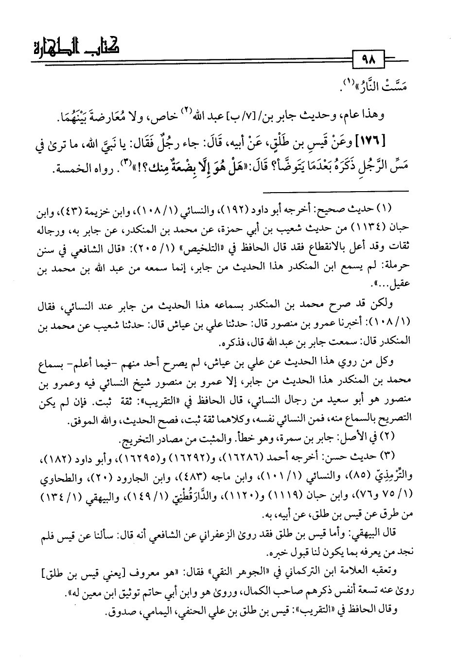 [176] وعَنْ قَيسِ بن طَلْقٍ، عَنْ أبيه، قَالَ: جاء رجُلٌ فَقَال: يا نَبيَّ اللَّه، ما ترى في مَسِّ الرَّجُلِ ذَكَرَهُ بَعْدَمَا يَتَوضَّأ؟ قَالَ: "هَلْ هُوَ إِلَّا بِضْعَةٌ مِنك؟ ! " (¬3). رواه الخمسة.