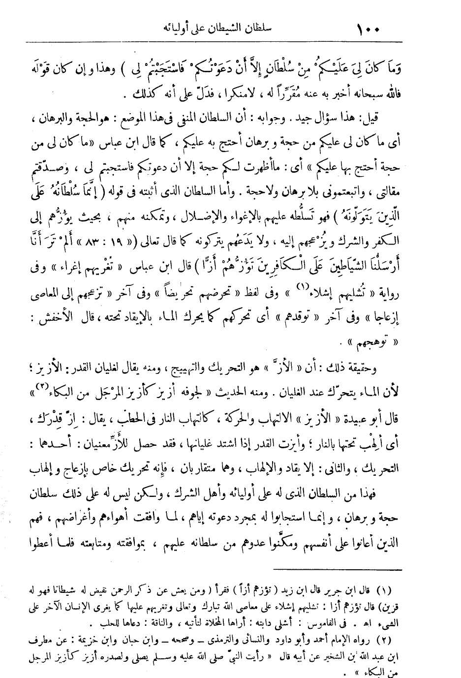 قيل: هذا سؤال جيد. وجوابه: أن السلطان المنفي فى هذا الموضع: هو الحجة والبرهان، أى ما كان لي عليكم من حجة وبرهان أحتج به عليكم، كما قال ابن عباس: "ما كان لي من حجة أحتج بها عليكم" أى: ما أظهرت لكم حجة إلا أن دعوتكم فاستجبتم لى، وصدقتم مقالتي، واتبعتمونى بلا برهان ولا حجة. فأما السلطان الذي أثبته فى قوله: {إِنَّما سُلْطَانُهُ عَلَى الَّذِينَ يَتَوَلَّوْنَهُ} [النحل: 100] .