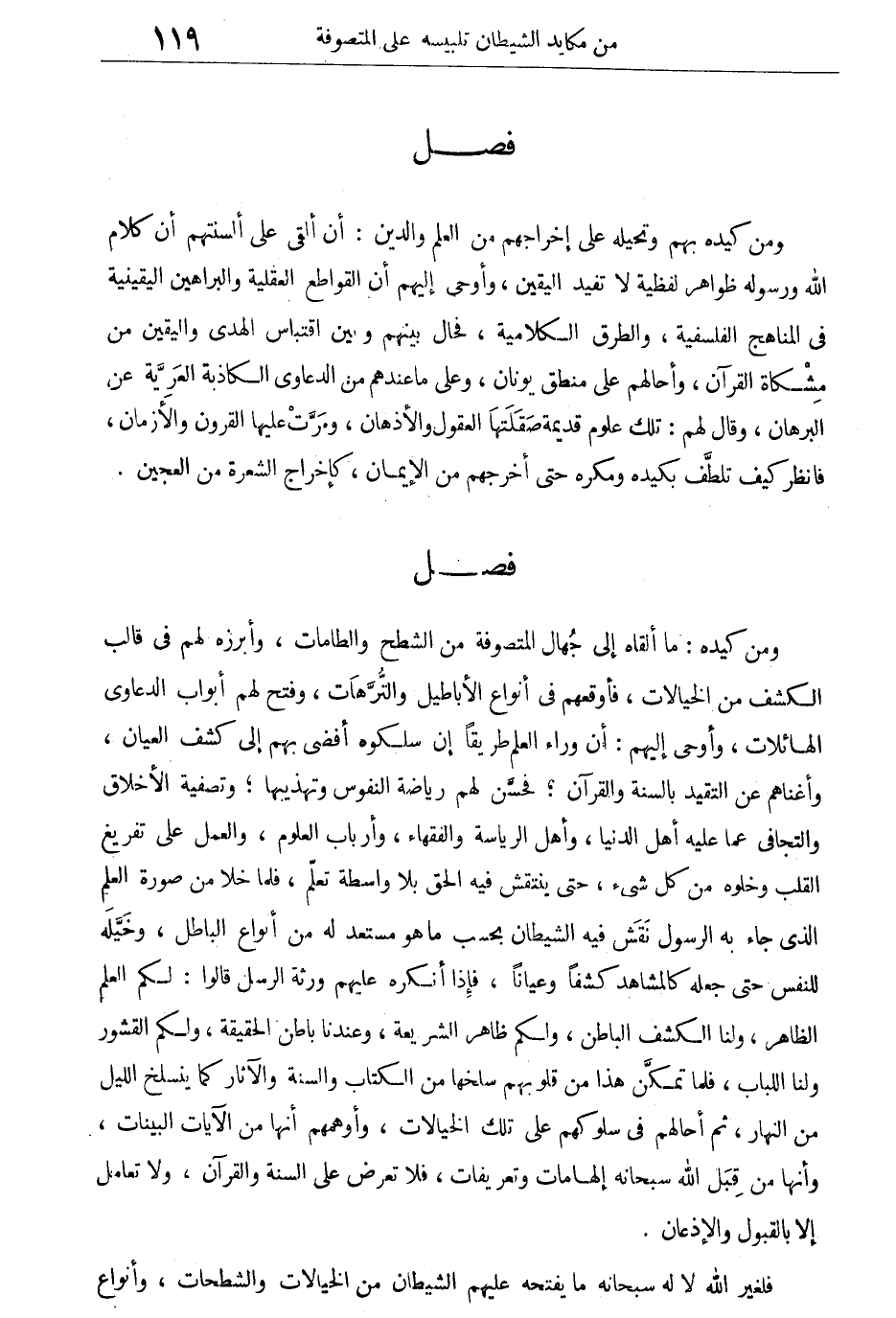 ومن كيده: ما ألقاه إلى جُهال المتصوفة من الشطح والطامات، وأبرزه لهم فى قالب الكشف من الخيالات، فأوقعهم فى أنواع الأباطيل والترهات، وفتح لهم أبواب الدعاوى الهائلات، وأوحى إليهم: أن وراء العلم طريقا إن سلكوه أفضى بهم إلى الكشف العيان، وأغناهم عن التقيد بالسنة والقرآن، فحسن لهم رياضة النفوس وتهذيبها، وتصفية الأخلاق والتجافى عما عليه أهل الدنيا، وأهل الرياسة والفقهاء، وأرباب العلوم والعمل على تفريغ القلب وخلوه من كل شىء، حتى ينتقش فيه الحق بلا واسطة تعلم، فلما خلا من صورة العلم الذى جاء به الرسول نقش فيه الشيطان بحسب ما هو مستعد له من أنواع الباطل، وخيله للنفس حتى جعله كالمشاهد كشفا وعيانا، فإذا أنكره عليهم ورثة الرسل قالوا: لكم العلم الظاهر، ولنا الكشف الباطن، ولكم ظاهر الشريعة، وعندنا باطن الحقيقة، ولكم القشور ولنا اللباب، فلما تمكن هذا من قلوبهم سلخها من الكتاب والسنة والآثار كما ينسلخ الليل عن النهار، ثم أحالهم فى سلوكهم على تلك الخيالات، وأوهمهم أنها عن الآيات البينات، وأنها من قبل الله سبحانه إلهامات وتعريفات فلا تعرض على السنة والقرآن، ولا تعامل إلا بالقبول والإذعان.