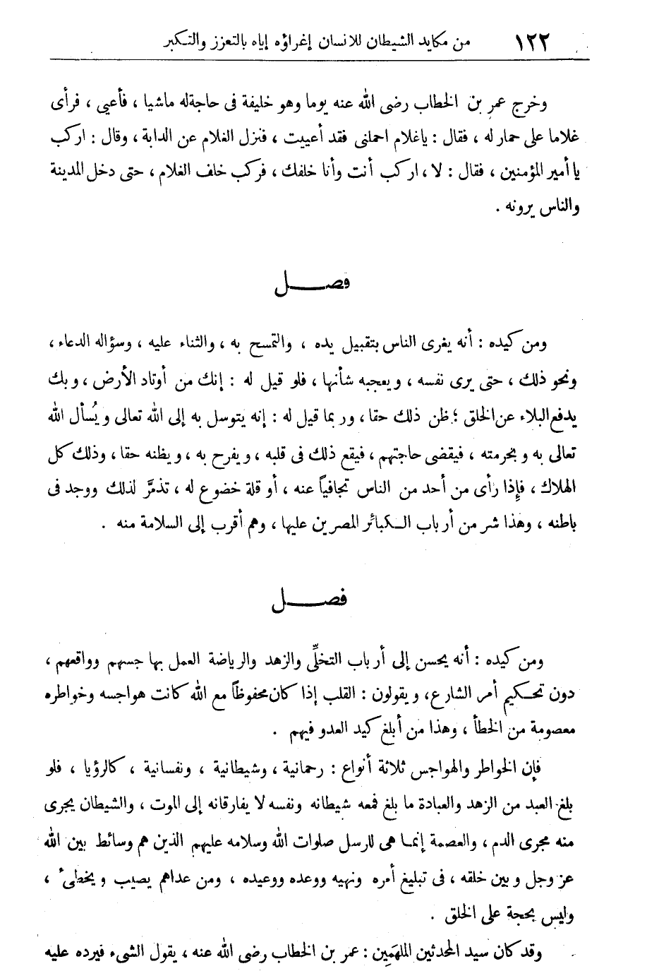 ومن كيده: أنه يغرى الناس بتقبيل يده، والتمسح به، والثناء عليه، وسؤاله الدعاء، ونحو ذلك، حتى يرى نفسه، ويعجبه شأنها، فلو قيل له: إنك من أوتاد الأرض، وبك يدفع البلاء عن الخلق، ظن ذلك حقا، وربما قيل له: إنه يتوسل به إلى الله تعالى ويسأل الله تعالى به وبحرمته، فيقضى حاجتهم، فيقع ذلك فى قلبه، ويفرح به، ويظنه حقا، وذلك كل الهلاك، فإذا رأى من أحد من الناس تجافيا عنه، أو قلة خضوع له، تذمر لذلك ووجد فى باطنه، وهذا شر من أرباب الكبائر المصرين عليها، وهم أقرب إلى السلامة منه.