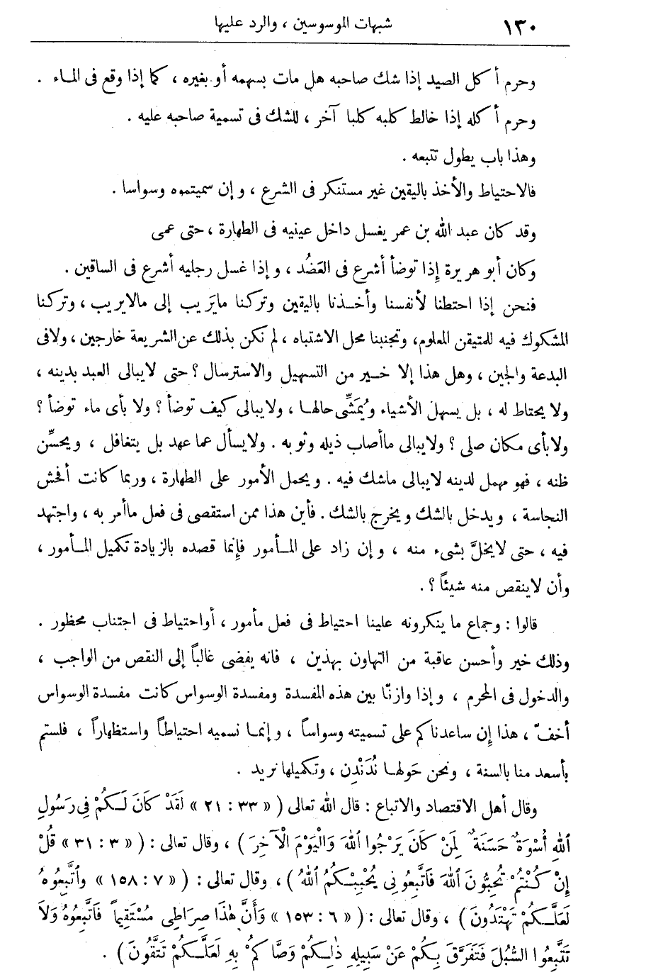قالوا: وجماع ما ينكرونه علينا احتياط فى فعل مأمور، أو احتياط فى اجتناب محظور وذلك خير وأحسن عاقبة من التهاون بهذين، فإنه يفضى غالبا إلى النقص من الواجب والدخول فى المحرم، وإذا وازنا بين هذه المفسدة ومفسدة الوسواس كانت مفسدة الوسواس أخف، هذا إن ساعدناكم على تسميته وسواسا، وإنما نسميه احتياطا واستظهارا فلستم بأسعد منا بالسنة، ونحن حولها ندندن، وتكميلها نريد.