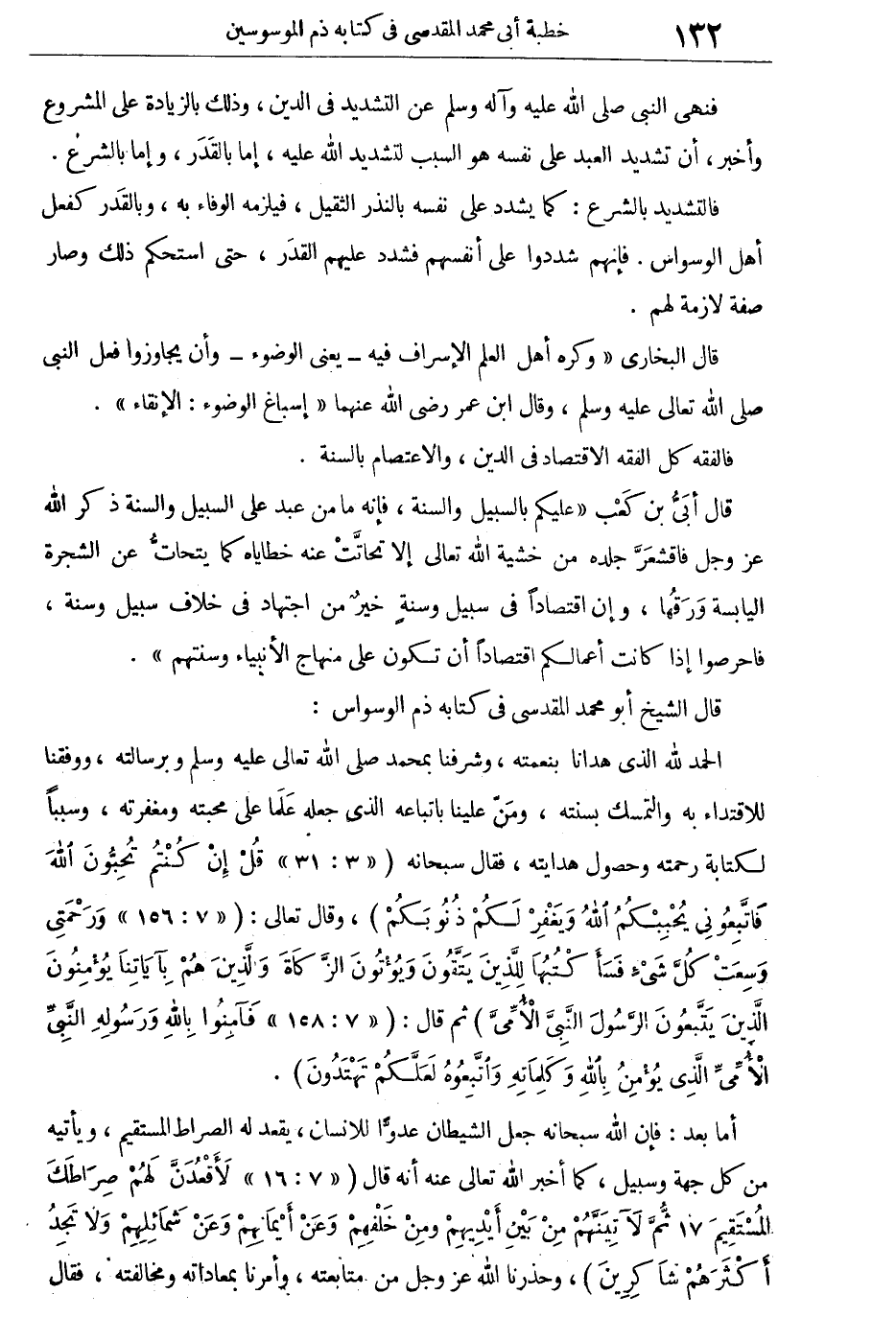 قال الشيخ أبو محمد المقدسى فى كتابه ذم الوسواس: "الحمد لله الذى هدانا بنعمه، وشرفنا بمحمد صلى الله تعالى عليه وسلم وبرسالته، ووفقنا للاقتداء به والتمسك بسنته، ومن علينا باتباعه الذى جعله علماً على محبته ومغفرته وسببا لكتابة رحمته وحصول هدايته، فقال سبحانه: {قُلْ إِنْ كُنْتُمْ تُحِبُّونَ اللَّهَ فَاتَّبِعُونِي يُحْبِبْكُمُ اللَّهُ وَيَغْفِرْ لَكُمْ ذُنُوبَكُمْ} [آل عمران: 31] ، وقال تعالى: {وَرَحْمَتِي وَسِعَتْ كُلَّ شَىْءٍ فَسَأَكْتُبُهَا لِلّذِينَ يَتّقُونَ} إلى قوله: {الّذِينَ يَتَّبِعُونَ الرَّسُولَ النّبىَّ الأمِّىَّ} [الأعراف: 156-157] ثم قال: {فَآمِنُوا بِاللهِ وَرَسُولِهِ النبى الأُمِّىَّ الّذِى يُؤْمِنْ بِاللهِ وَكِلمَاتِهِ وَاتّبِعُوهُ لَعَلّكُمْ تَهْتَدُونَ} [الأعراف: 158] . أما بعد: فإن الله سبحانه جعل الشيطان عدوا للإنسان، يقعد له الصراط المستقيم، ويأتيه من كل جهة وسبيل، كما أخبر الله تعالى عنه أنه قال: {لأقْعُدَنّ لَهُمْ صِرَاطَكَ المسْتَقِيمَ ثُمَّ لآتِيَنّهُمْ مِنْ بَيْنِ أَيْدِيهِمْ وَمِنْ خَلْفِهِمْ وَعَنْ أَيمْاَنهم وَعَنْ شَمَائِلِهِمْ وَلا تَجِدُ أَكْثَرَهُمْ شَاكِرِينَ} [الأعراف: 16-17] . وحذرناً الله عز وجل من متابعته، وأمرنا بمعاداته ومخالفته، فقال