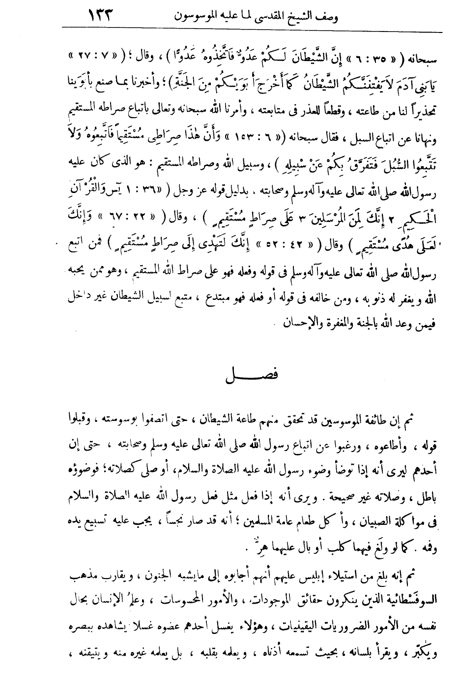 ثم إن طائفة الموسوسين قد تحقق منهم طاعة الشيطان، حتى اتصفوا بوسوسته. وقبلوا قوله، وأطاعوه، ورغبوا عن اتباع رسول الله صلى الله تعالى عليه وسلم وصحابته، حتى إن أحدهم ليرى أنه إذا توضأ وضوء رسول الله عليه الصلاة والسلام أو صلى كصلاته، فوضوؤه باطل، وصلاته غير صحيحة. ويرى أنه إذا فعل مثل فعل رسول الله عليه الصلاة والسلام فى مؤاكلة الصبيان، وأكل طعام عامة المسلمين، أنه قد صار نجساً يجب عليه تسبيع يده وفيه، كما لو ولغ فيهما كلب أو بال عليهما هر.