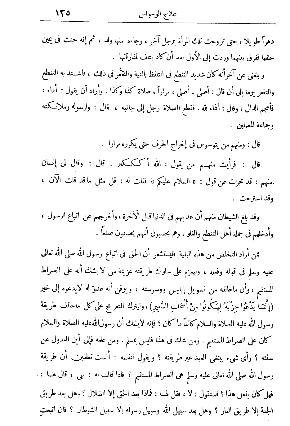 فمن أراد التخلص من هذه البلية فليستشعر أن الحق فى اتباع رسول الله صلى الله تعالى عليه وسلم فى قوله وفعله، وليعزم على سلوك طريقة عزيمة من لا يشك أنه على الصراط المستقيم، وأن ما خالفه من تسويل إبليس ووسوسته، ويوقن أنه عدو له لا يدعوه إلى خير.