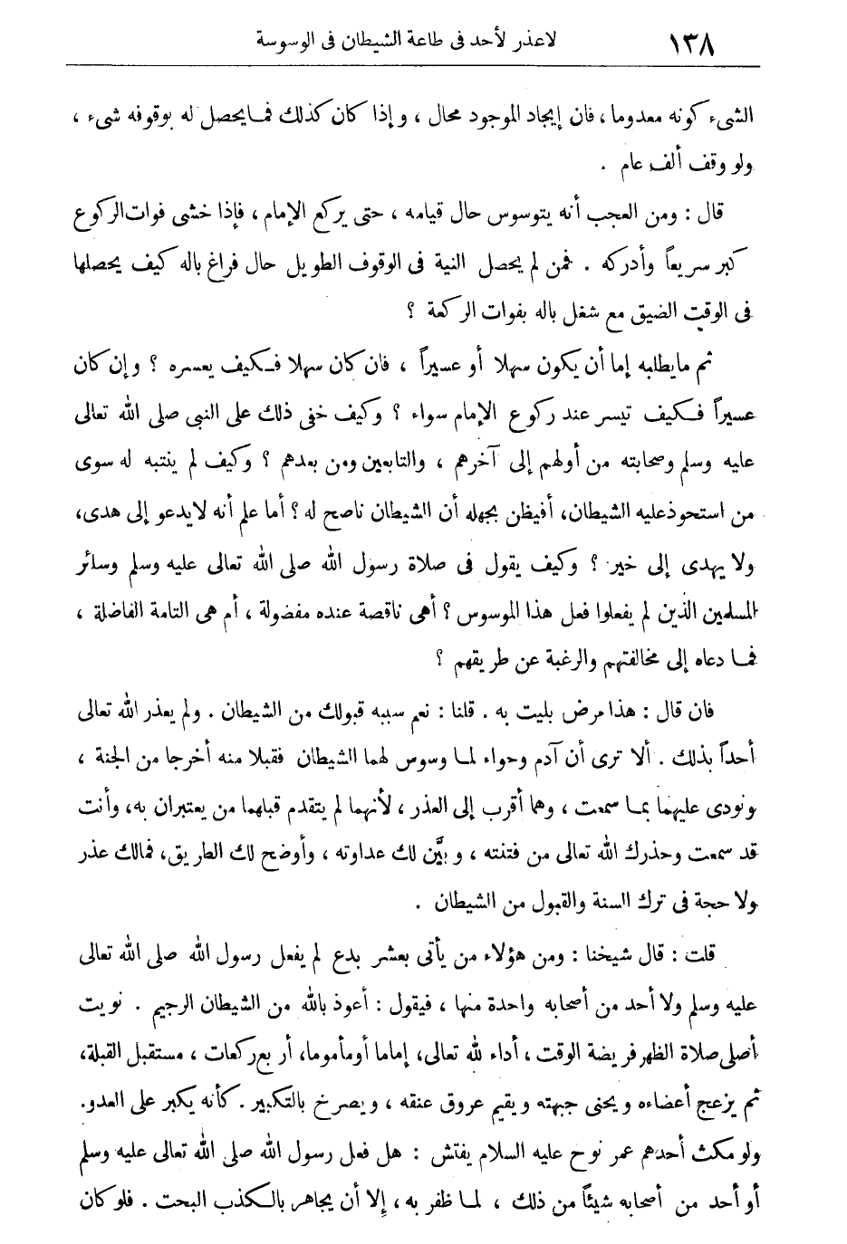 ثم ما يطلبه إما أن يكون سهلاً أو عسيراً، فإن كان سهلاً فكيف يعسره؟ وإن كان عسيراً فكيف تيسر عند ركوع الإمام سواه؟ وكيف خفى ذلك على النبى صلى الله تعالى عليه وسلم وصحابته من أولهم إلى آخرهم، والتابعين ومن بعدهم؟ وكيف لم ينتبه له سوى من استحوذ عليه الشيطان، أفيظن بجهله أن الشيطان ناصح له؟ أما علم أنه لا يدعو إلى هدى، ولا يهدى إلى خير؟ وكيف يقول فى صلاة رسول الله صلى الله تعالى عليه وسلم وسائر المسلمين الذين لم يفعلوا فعل هذا الموسوس؟ أهى ناقصة عنده مفضولة؟ أم هى التامة الفاضلة؟ فما دعاه إلى مخالفتهم والرغبة عن طريقهم؟.