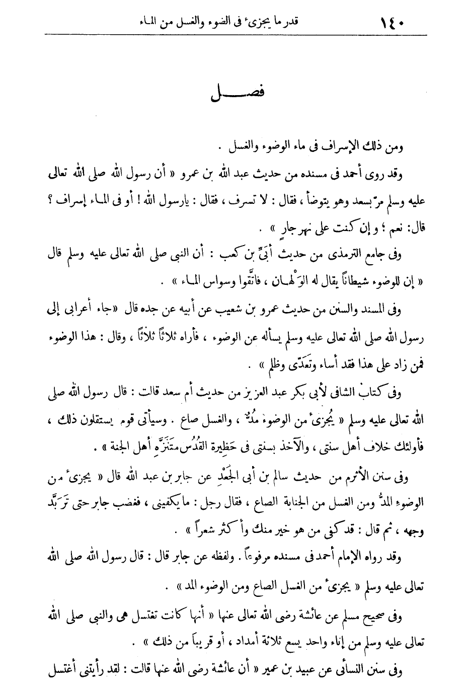 وقد روى أحمد فى مسنده من حديث عبد الله بن عمرو: "أنّ رَسُولَ الله صلّى اللهُ تَعَالَى عَلَيْهِ وسّلَم مَرَّ بِسَعْدٍ وَهُوَ يَتَوَضّأُ، فَقالَ: لا تُسْرِفْ، فَقَالَ: يَا رَسُولَ اللهِ، أَوَفِى المَاءِ إِسْرَافٌ؟ قَالَ: نَعَمْ، وَإنْ كُنْتَ عَلَى نَهْرٍ جَارٍ".