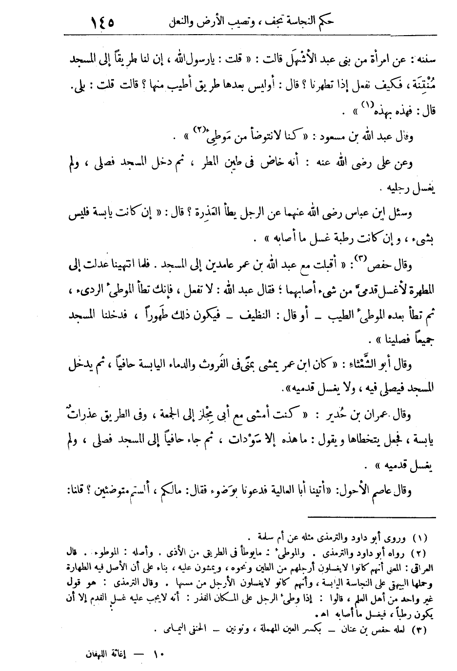 وقال حفص: أقبلت مع عبد الله بن عمر عامدين إلى المسجد. فلما انتهينا عدلت إلى المطهرة لأغسل قدمى من شىء أصابهما، فقال عبد الله: لا تفعل، فإنك تطأ الموطىء الردئ، ثم تطأ بعده الموطئ الطيب- أو قال: النظيف- فيكون ذلك طهوراً، فدخلنا المسجد جميعاً فصلينا.