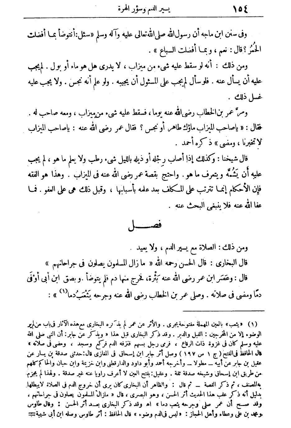 قال: "وعصر ابن عمر رضى الله عنهما بثرة، فخرج منها دم فلم يتوضأ، وبصق ابن أبى أو فى دما ومضى فى صلاته. وصلى عمر بن الخطاب رضى الله عنه وجرحه يثعب دما".