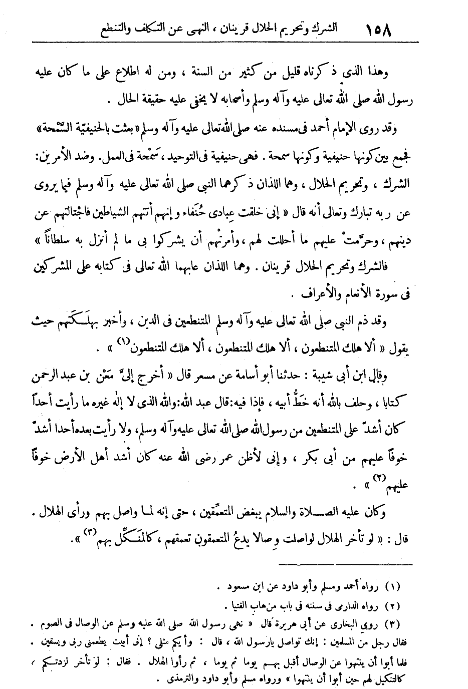 "أَلا هَلَكَ المُتَنَطعُونَ، أَلا هَلَكَ المُتَنَطعُونَ، أَلا هَلَكَ المُتَنَطعُونَ". وقال ابن أبى شيبة: حدثنا أبو أسامة عن مسعر قال: "أخرج إلى معن بن عبد الرحمن كتاباً، وحلف بالله أنه خط أبيه، فإذا فيه: قال عبد الله: والله الذى لا إله غيره ما رأيت أحداً كان أشد على المتنطعين من رسول الله صلى الله تعالى عليه وآله وسلم، ولا رأيت بعده أحداً أشد خوفاً عليهم من أبى بكر، وإنى لأظن عمر رضى الله عنه كان أشد أهل الأرض خوفاً عليهم".