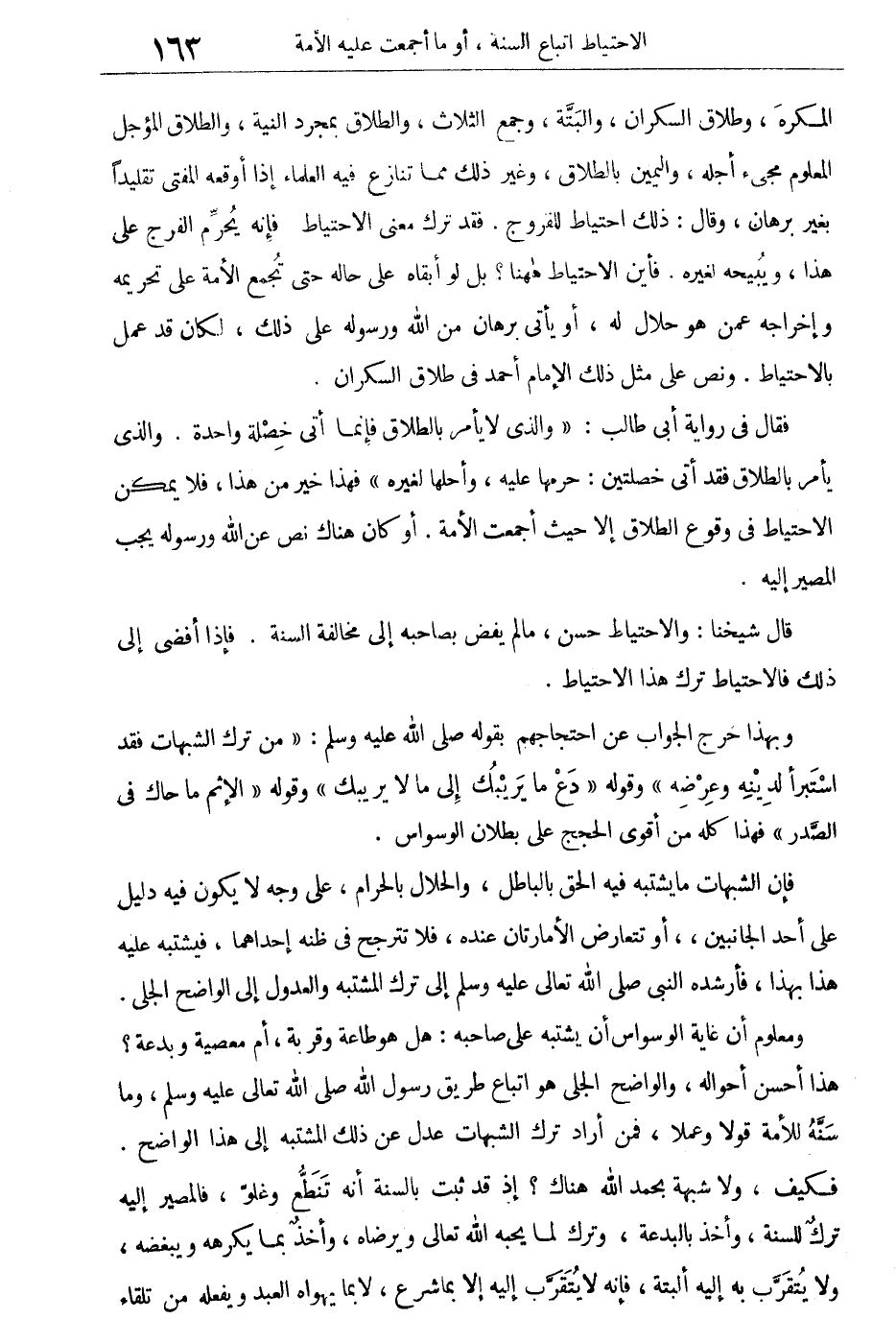 قال شيخنا: "والاحتياط حسن، ما لم يفض بصاحبه إلى مخالفة السنة. فإذا أفضى إلى ذلك فالاحتياط ترك هذا الاحتياط"، وبهذا خرج الجواب عن احتجاجهم بقوله صلى الله عليه وسلم: "مَنْ تَرَكَ الشُّبُهَاتِ فَقَدِ اسْتَبْرَأَ لِدِينِه وَعِرْضِهِ" وقوله: "دَعْ مَا يَرِيبُكَ إِلَى مَا لاَ يَرِيبُكَ" وقوله: "الإِثمُ مَا حَاكَ فى الصَّدْرِ".