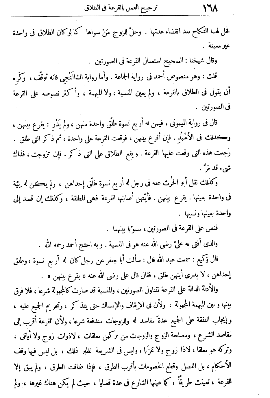 وكذلك نقل أبو الحارث عنه فى رجل له أربع نسوة طلق إحداهن، ولم يكن له نية فى واحدة بعينها: "يقرع بينهن فأيتهن أصابتها القرعة فهى المطلقة، وكذلك إن قصد إلى واحدة بعينها ونسيها".